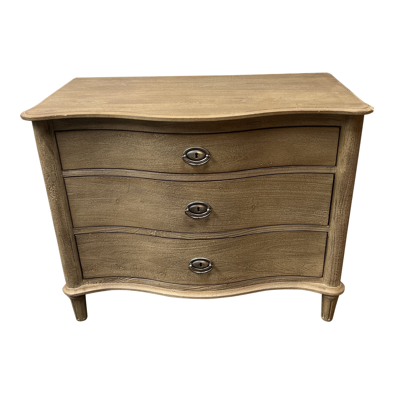 Design Plus Gallery presents an Empire Rosette Closed Nightstand by Restoration Hardware. Features a bow front and antique nickel hardware. Crafted of solid hardwood, carefully distressed using a hand-applied multistep process to achieve the look of a weathered antique. Crafted with Mortise-and-tenon joinery and English-dovetailed drawers. Minor wear from usage. The finish is Antiqued Grey. Does not come with key. Made in Vietnam.