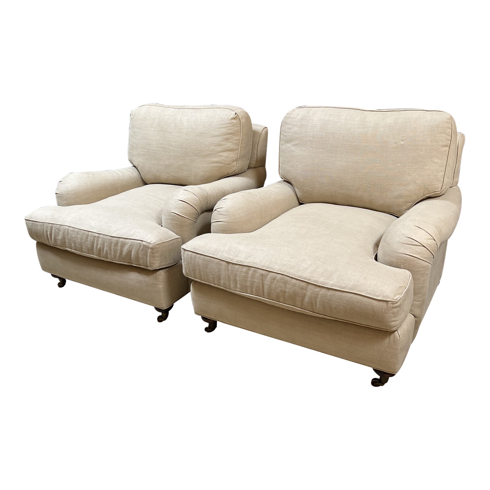 Design Plus Gallery presents the Restoration Hardware English Roll Arm Chairs, a Pair. Features include round wooden legs with wheels for ease of transport, rolled arms, and removable seat and back cushions. The seat cushions are T-shaped and cover the lower front of the rolled arms. The upholstery is a cream-color fabric. Welting is present throughout the chairs and its cushions. Minor wear from use; chairs are in good condition.