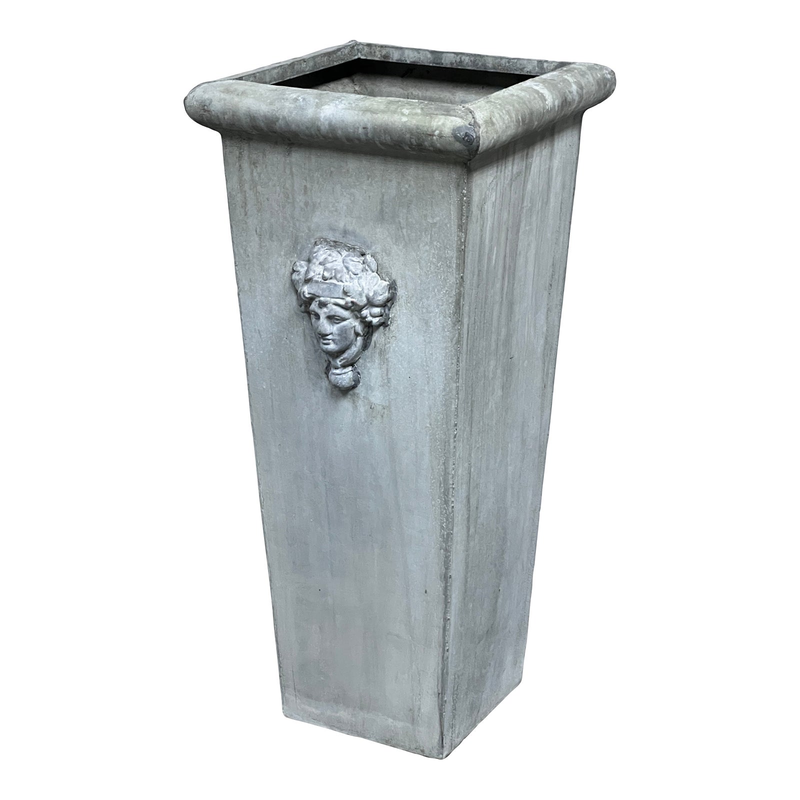 Design Plus Gallery presents an Estate Zinc Selene Taper Tall Planter from Restoration Hardware. Recalling pots from 19th-century English and Belgian estate gardens, this stately planter is crafted from heavy-gauge steel dipped in molten zinc in a family-owned workshop in Bulgaria. The zinc finish acquires a soft grey patina over time making it ideal for lining a pathway, accenting a patio, or framing a doorway. This planter are graced with a portrait of the Greek goddess of the moon, inspired by a fin de siècle English garden sculpture. Fitted with one drainage hole. In good condition wear consistent with age + use.