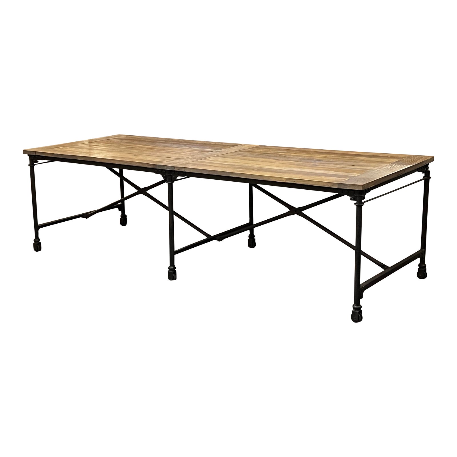 Design Plus Gallery presents a Flat Iron Table + Work Table by Restoration Hardware. Manufactured by RecycledwWood. Combining antiqued elm and distressed cast metal creates an industrial appeal. The welded, riveted solid steel frame stands on caster wheels, while the rustic nature reveals the antiqued reclaimed elm’s age and provenance. Use coasters under beverages to prevent marks and stains. Light evidence of surface wear; rustic reclaimed nature is intentional; small chips in paint on base; casters are not meant to be functional.