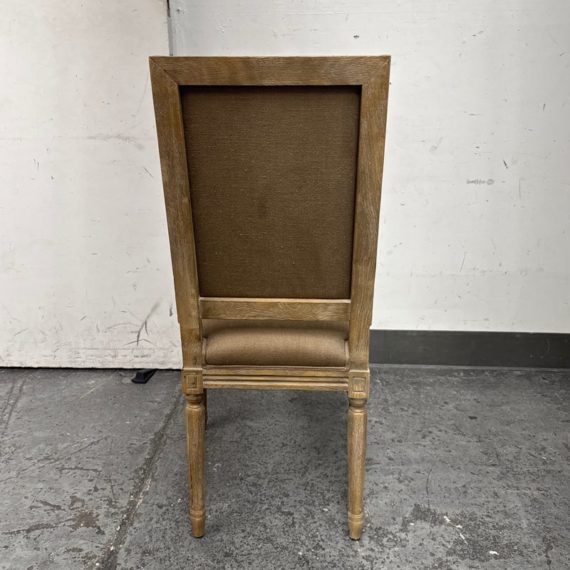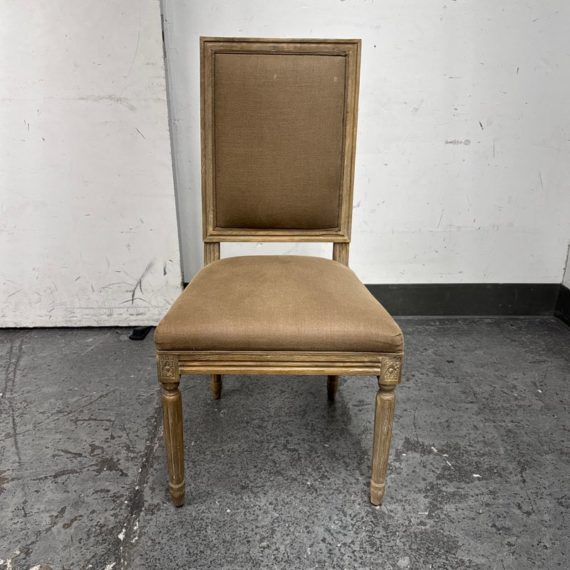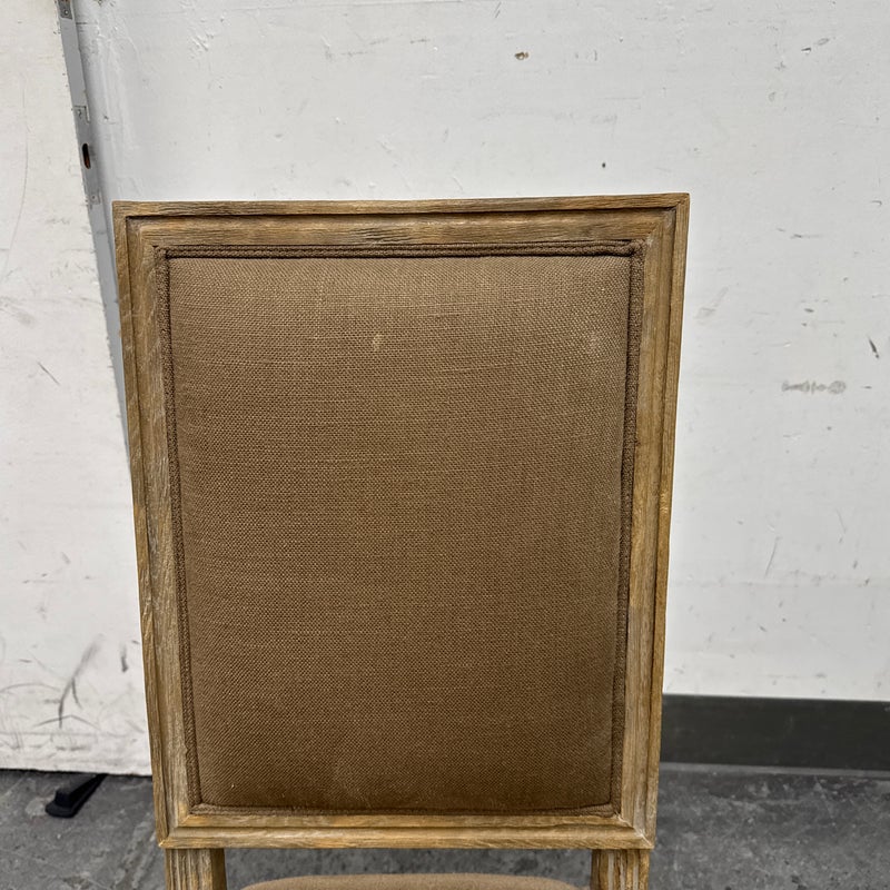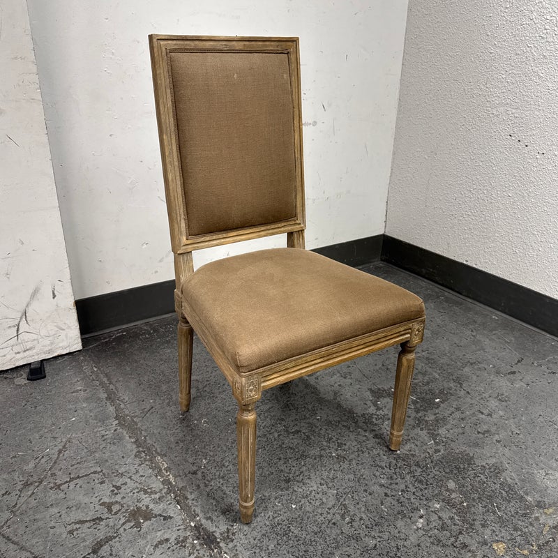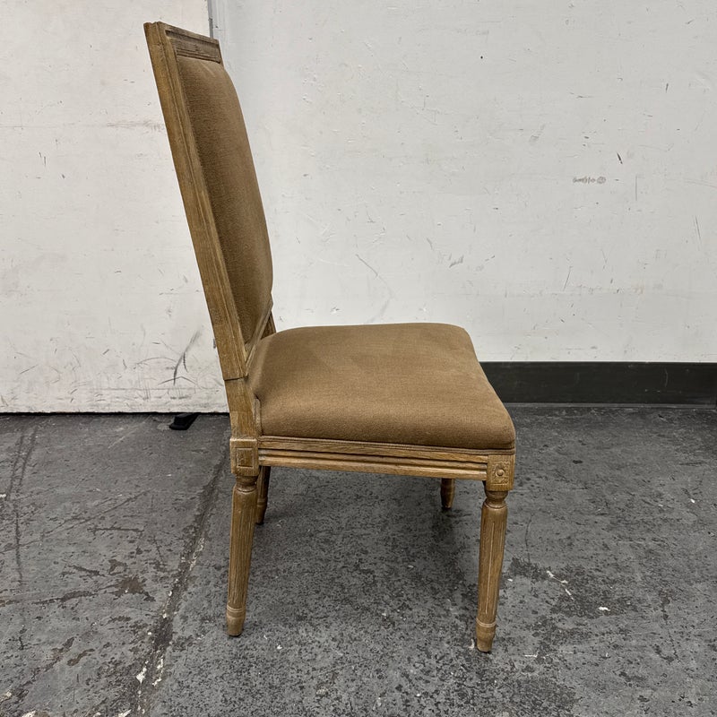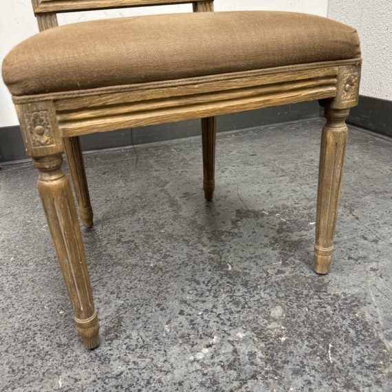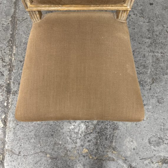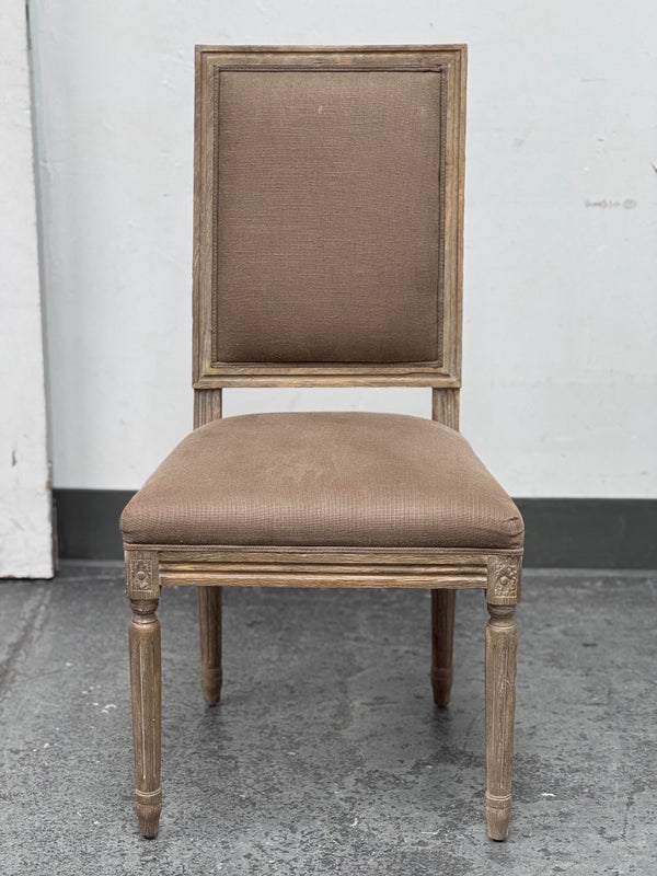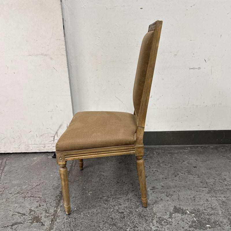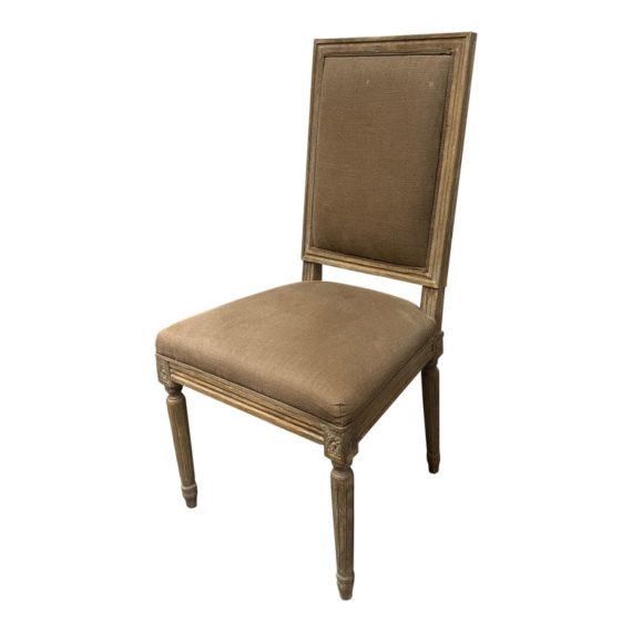 Design Plus Gallery presents a French Dining Chair from Restoration Hardware. The chair offers a design style that is of a neoclassical era with its elegant restraint. The weathered appearance goes naturally with the design style. Is in good condition with visible wear to the fabric that is consistent with use + age. Is a discontinued item.