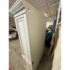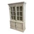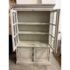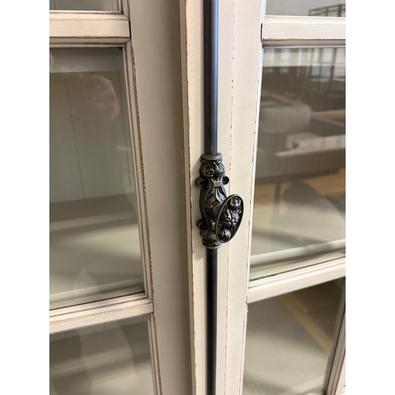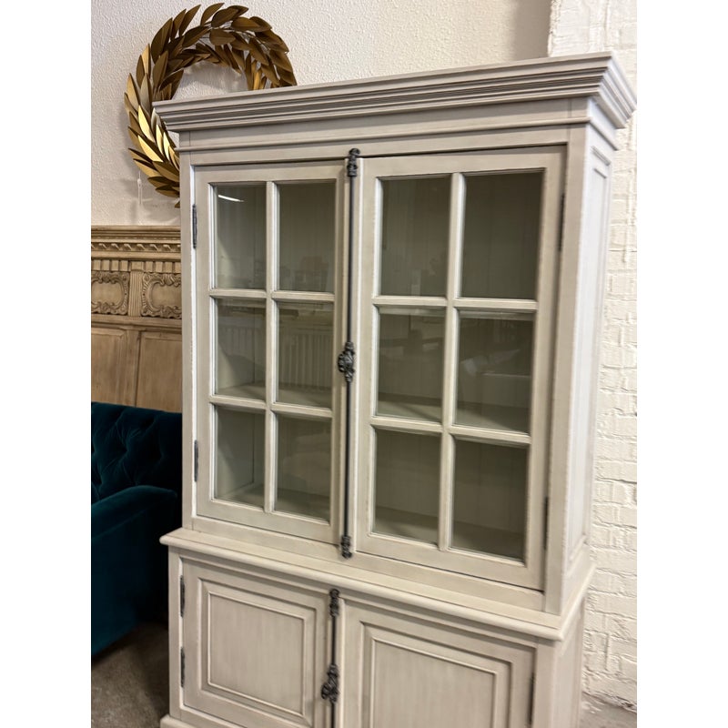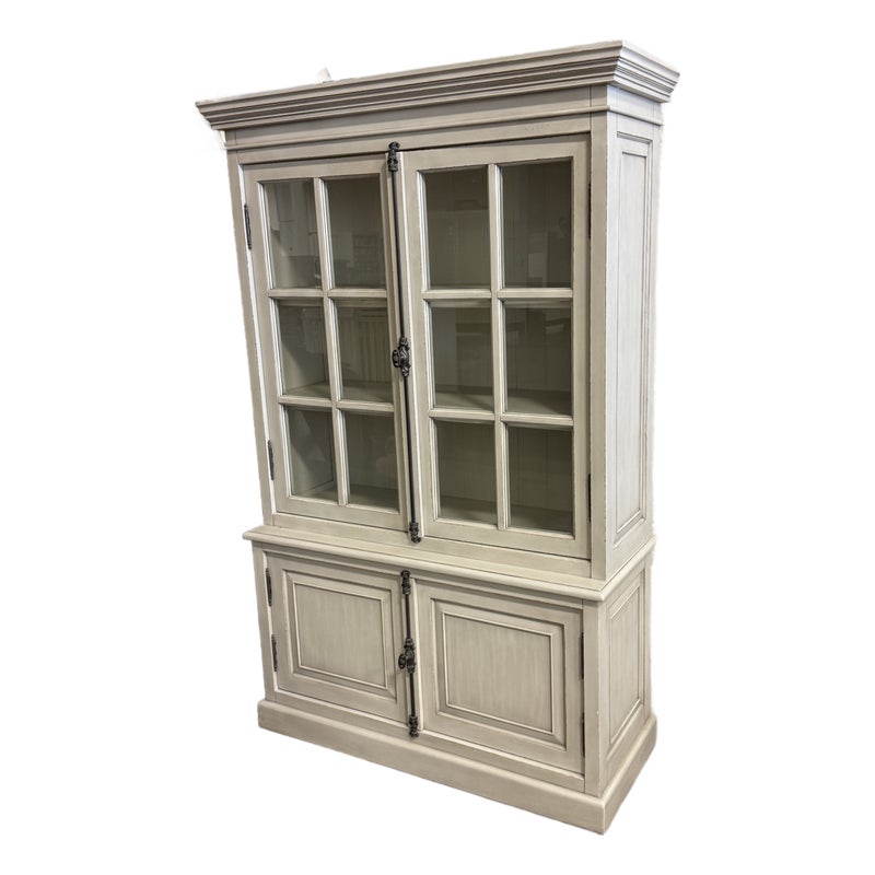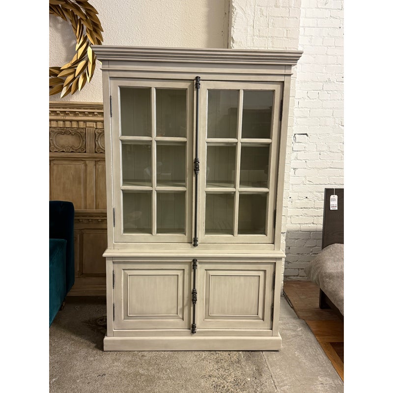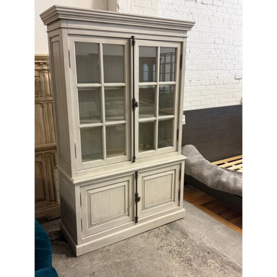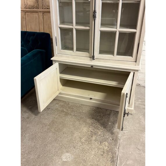 Design Plus Gallery presents a Restoration Hardware French Casement Cabinet. This piece has classic casework, crown molding, and paneled sides in a soft ivory tone. The upper hutch has two glass casement doors with divided-light grids, opening to a painted interior with fixed shelving and a vertical plank back panel. The lower cabinet offers two paneled doors for concealed storage, finished with decorative metal escutcheons, drop pulls, and traditional hinges that complement the overall profile. This is a discontinued model with the brand and is in good condition with visible and minimal wear from usage.