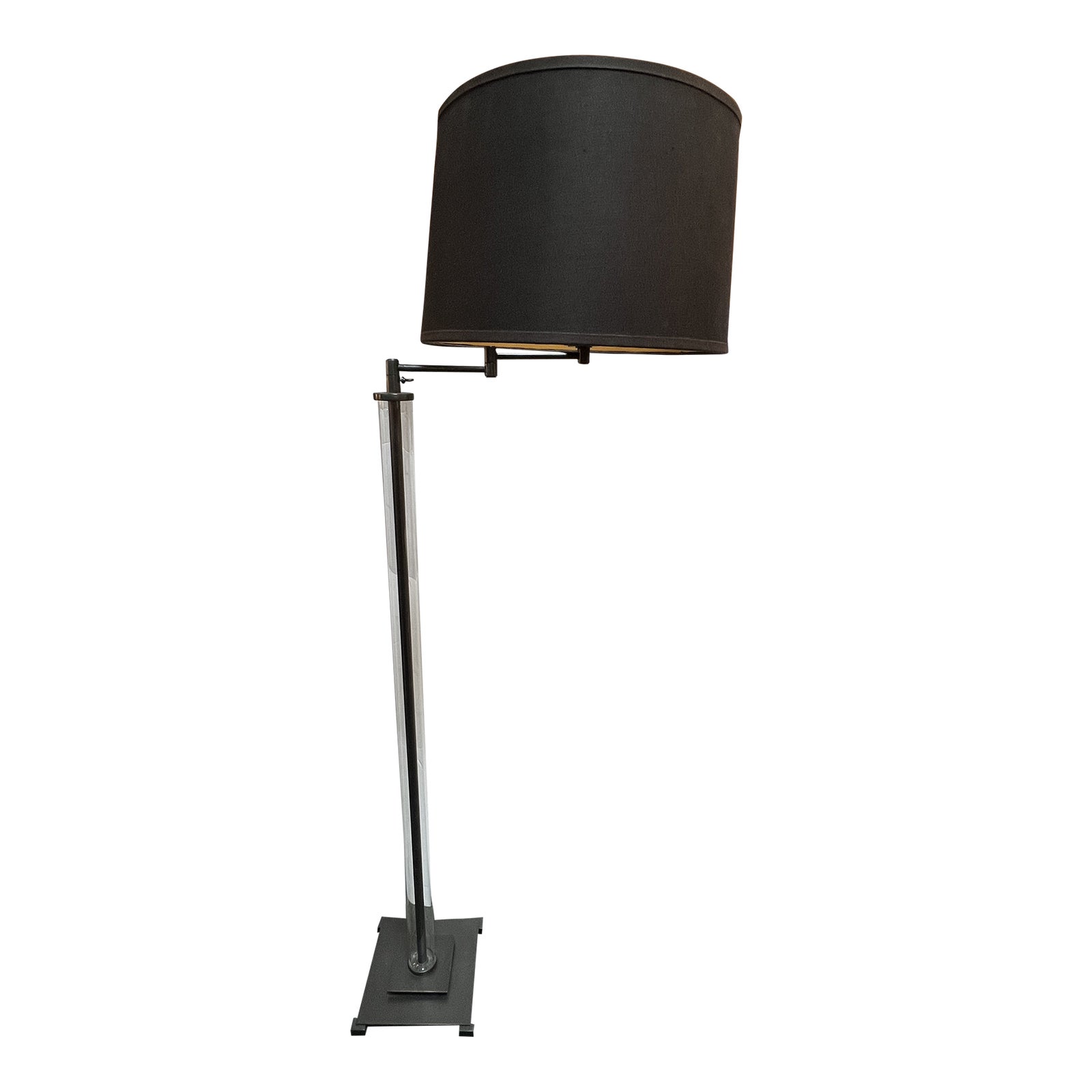Desig Plus Gallery presents a French Column Floor Lamp by Restoration Hardware. Sheathing the bronze metal in a crystal clear glass column and pairing it with a gold-lined black French Drum shade is elegant genius. The column extends up and the articulated arm throws light where needed. 110-120V, uses one 100W max. E26-base bulb, not included. Bulbs included. Little evidence of wear, good condition.
