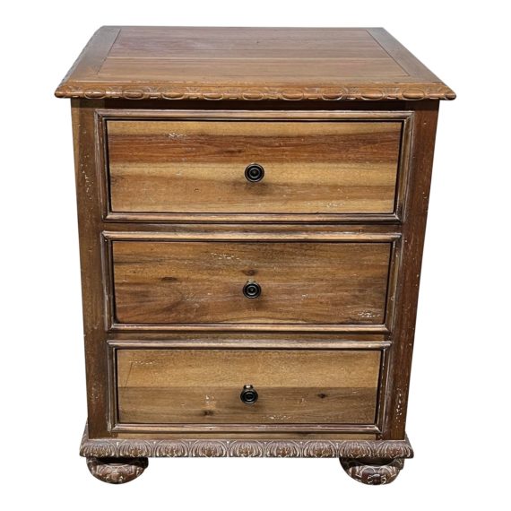 Design Plus Gallery presents a French Empire 3 Drawer Nightstand by Restoration Hardware. Details common to Second Empire furnishings, include Bun feet and intricate carvings. An homage to mid-19th-century France’s glorious past. Solid wood nightstand is hand-finished in a weathered, distressed patina, drawers have cast bronze pulls. Light evidence of surface wear, consistent with age and use.