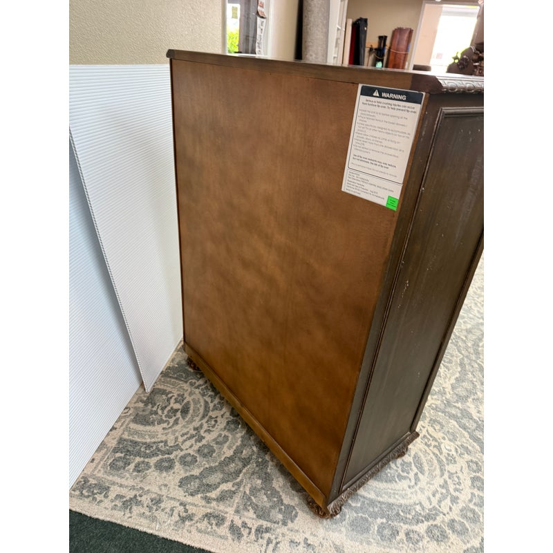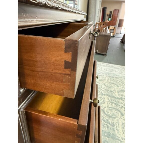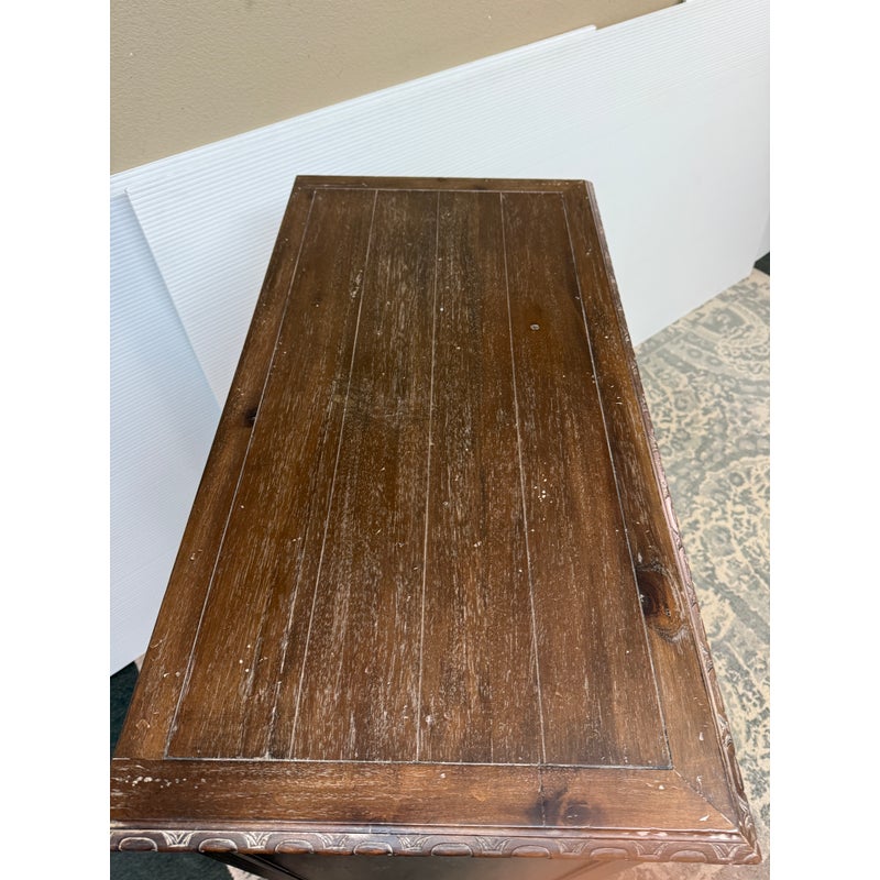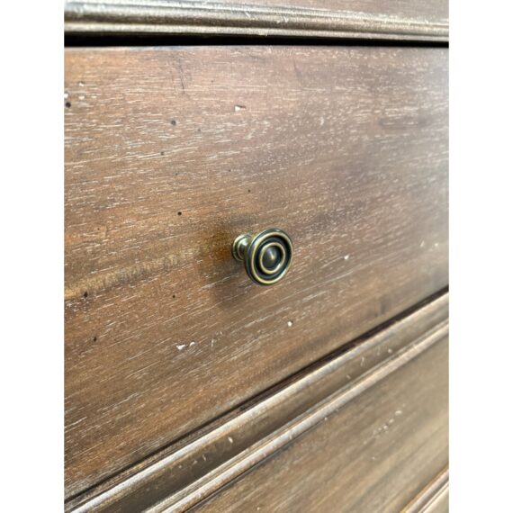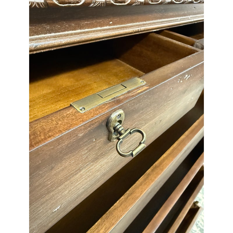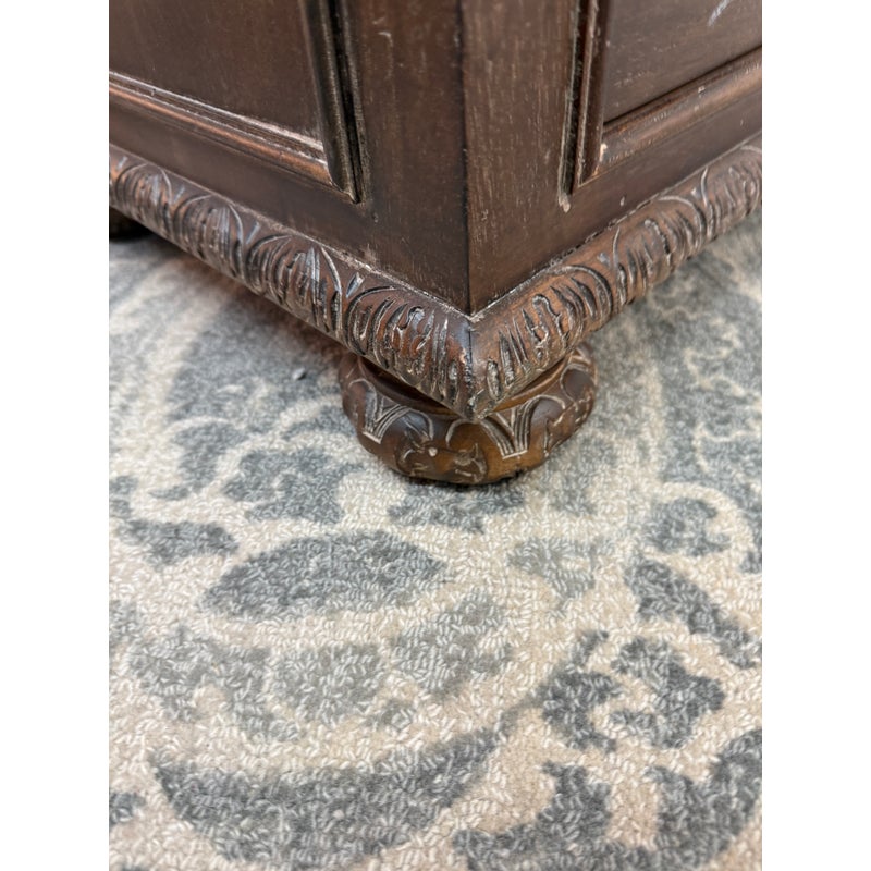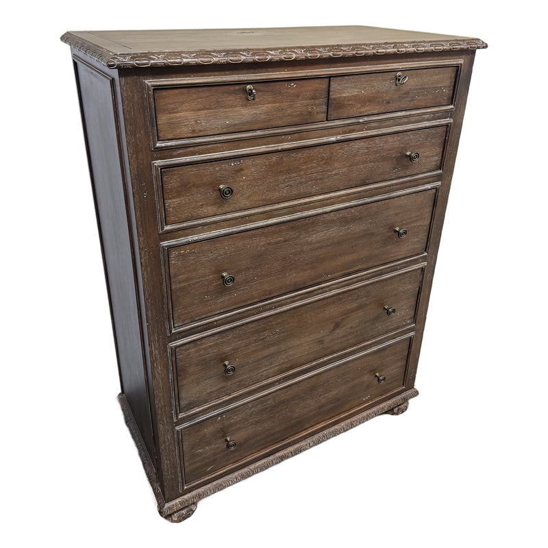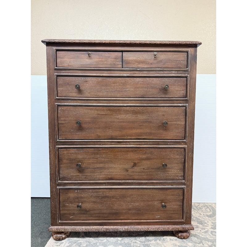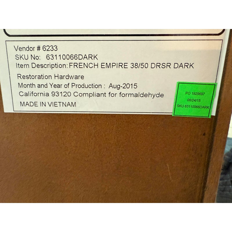 Design Plus Gallery presents a French Empire 6-Drawer Dresser by Restoration Hardware. Ornate hand carving and bun feet define the second Empire-inspired collection. A mid-19th-century French style characterized by the use of rich woods and decorative molding. Carefully hand-finished using an intensive 7-step finishing process, which results in a weathered, distressed patina. In good condition, visible and minimal wear. This is a discontinued model. Made in Vietnam.