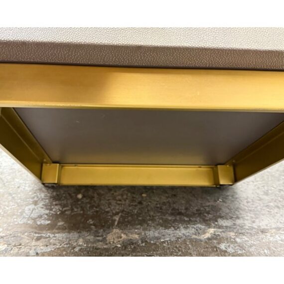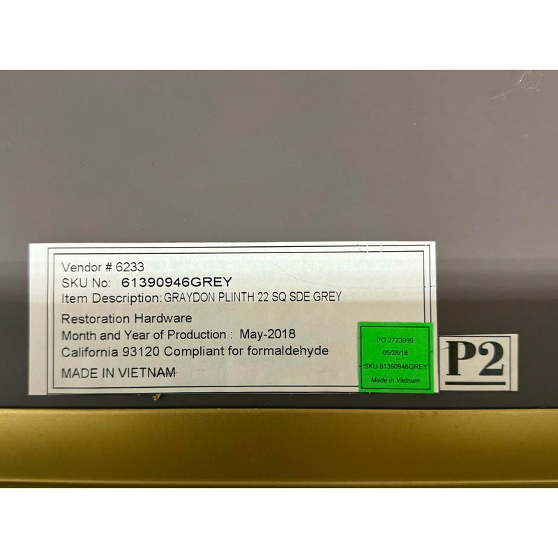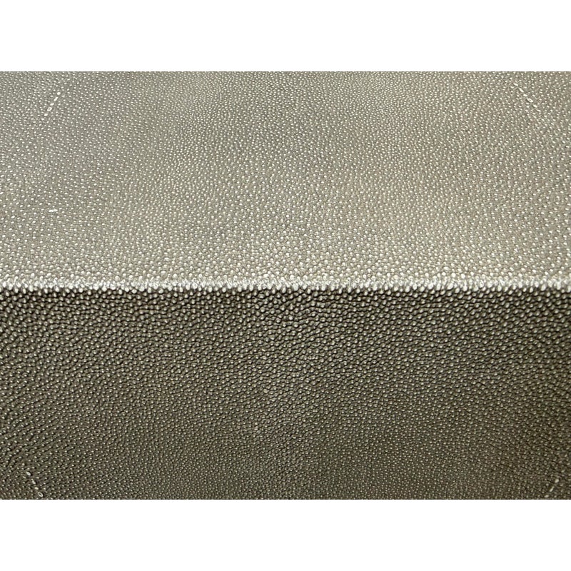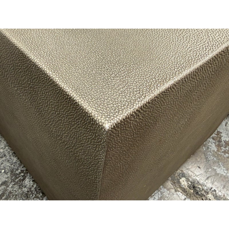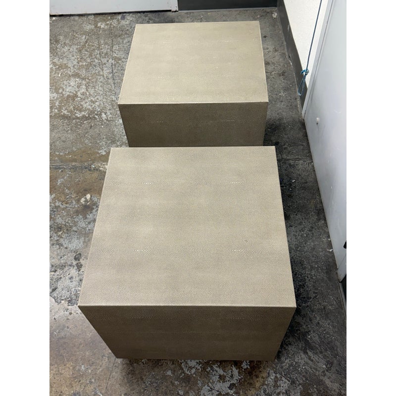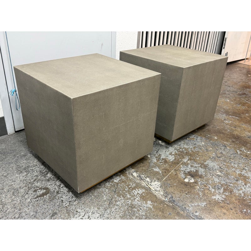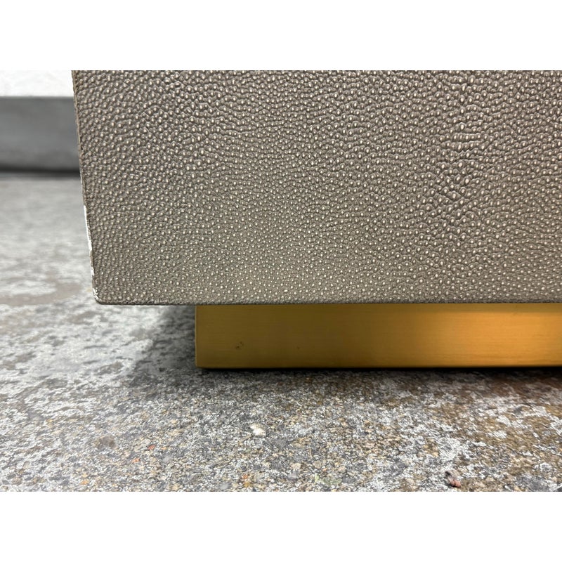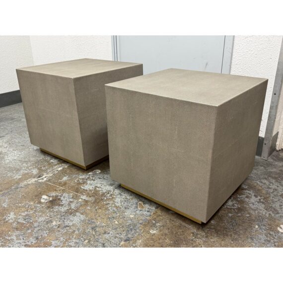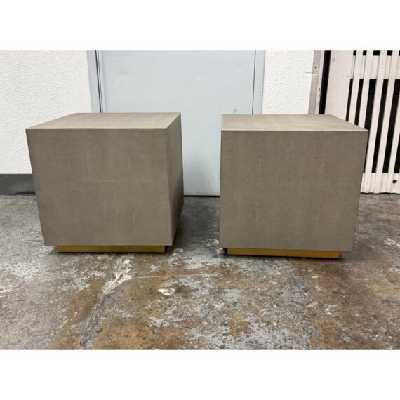 Design Plus Gallery presents a Pair of Graydon Shagreen Plinth Side Tables from Restoration Hardware. A sculptural accent inspired by the 1930’s Parisian designs. Defined by a clean, architectural cube form, this side table makes a confident statement while remaining versatile enough to pair with a range of interiors. The exterior is wrapped in gray shagreen-embossed leather, an exacting reproduction of the distinctive texture and subtly layered pattern associated with natural stingray hide. A recessed base in burnished brass adds a hint of contrast and sheen, giving the piece a subtle lift from the floor. They are in good condition with visible and minimal wear from usage. Made in Vietnam.