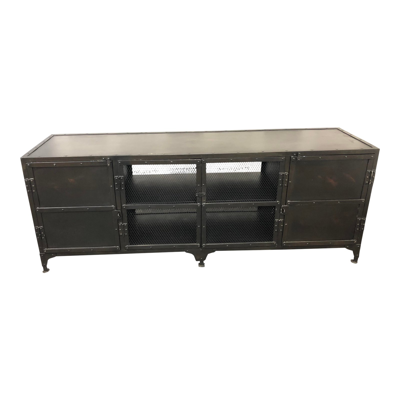 Design Plus Gallery presents a Industrial Tool Chest Media by Restoration Hardware. A reproduction of a circa 1900 toolbox from a French automobile factory. Handcrafted of iron and held with exposed rivets with hand-applied, 4-step finishing process lends it the patina of a burnished antique. Features 2 solid doors and 2 mesh center doors. Mesh doors are screened to allow operation of remote controls. All doors close with push magnets. Back opening for wire management Single fixed shelf inside. The finish is Blackened Iron. Perfectly suitable as a console, media stand or sideboard.
