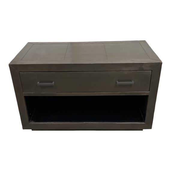 Design Plus Gallery presents a Restoration Hardware La Salle Metal Open Nightstand. Crafted of wood and hand-wrapped in sheet metal Mortise-and-tenon joinery Zinc finish is hand applied to brass sheet and antiqued for a mottled, uneven appearance that lends it its unique character Aged Bronze finish is hand applied to brass sheet and antiqued by hand Reactive finish will change over time, growing deeper, richer and more burnished Thousands of hand-hammered nails secure and accent the sheet metal Solid wood drawer Plinth base wrapped in metal Iron hardware This item is artisan crafted with meticulous care. Given its handmade and hand-finished nature, variations and imperfections in the metal are to be expected and celebrated. Each item is an original and no two are exactly alike. There is minor wear through out. Made in India.