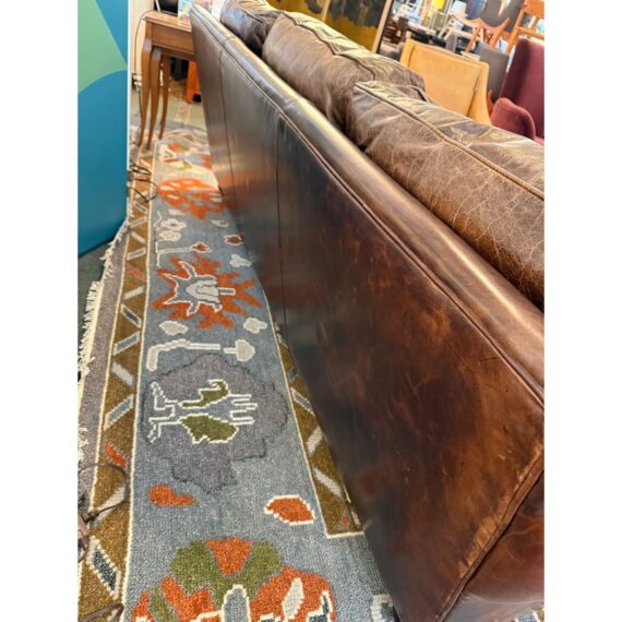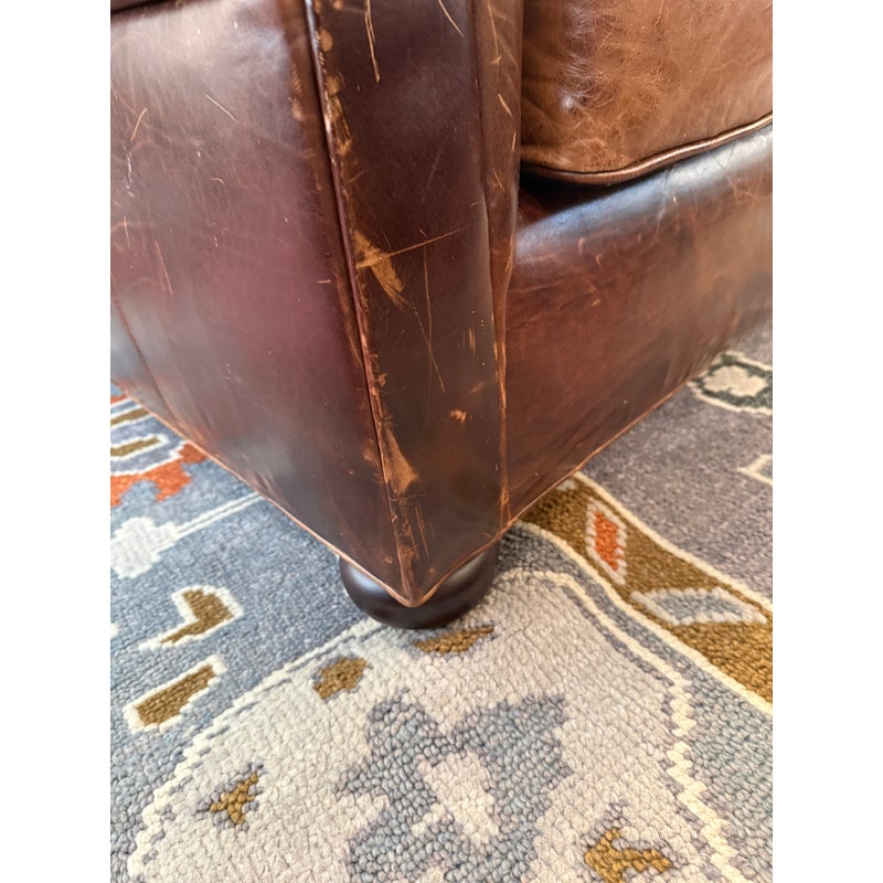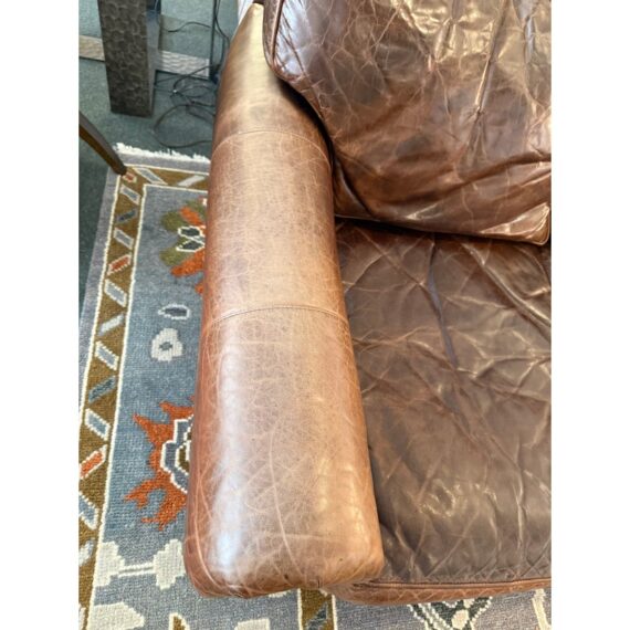 Design Plus Gallery presents a Lancaster Leather Sofa from Restoration Hardware. Its gorgeous Brompton leather was produced by a tannery in Vicenza, Italy called Concernia Bernado Finco Spa. The loose down-wrapped cushions seating and classic style of the Lancaster sofa will always invite comfort. The traditional profile is elevated slightly on turned bun feet. There is visible sun damage on the left arm and small marks on the right. This item is in fair/good condition, visible and minimal distressed surface wear that’s consistent with use.