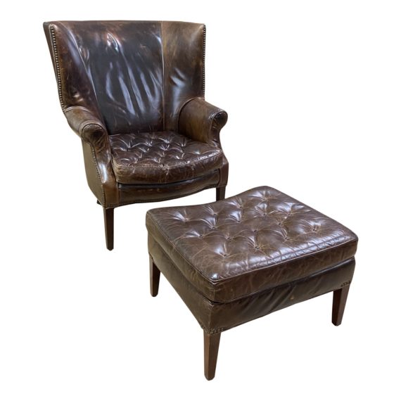 Design Plus Gallery presents a Restoration Hardware Leather Drake Chair + Ottoman. Kiln-dried hardwood frame combines sophisticated details like a curved back, deep wings antique brass nailhead trim and button tufting. Thick seat cushion is button-tufted a standard fill (polyfiber wrapped around a resilient foam core.) Hardwood legs stained to match the tipped leather. Visible wear with usage.