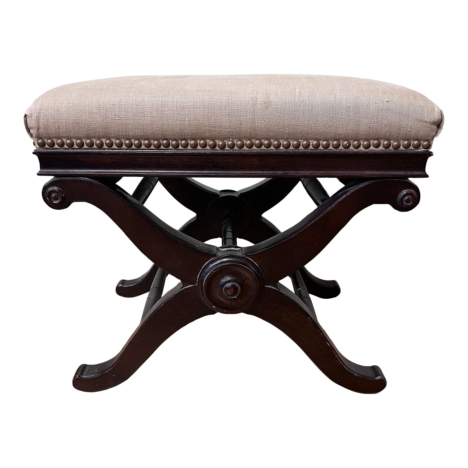 Design Plus Gallery presents a Linen, Nailhead and Wood Footstool from Restoration Hardware. Contemporary styling with a traditional twist make this a refined and easy statement piece. Can be used in a variety of placements; from the bathroom to the living room and fantastic in the bedroom. Is in good condition with some surface wear on the upholstery that can be spot cleaned.