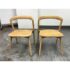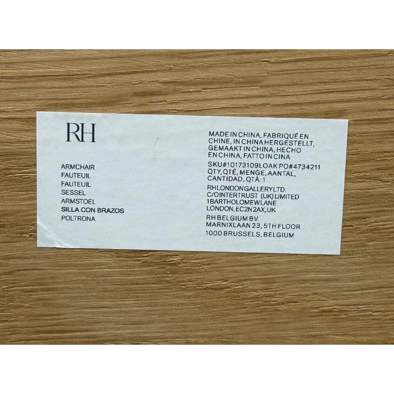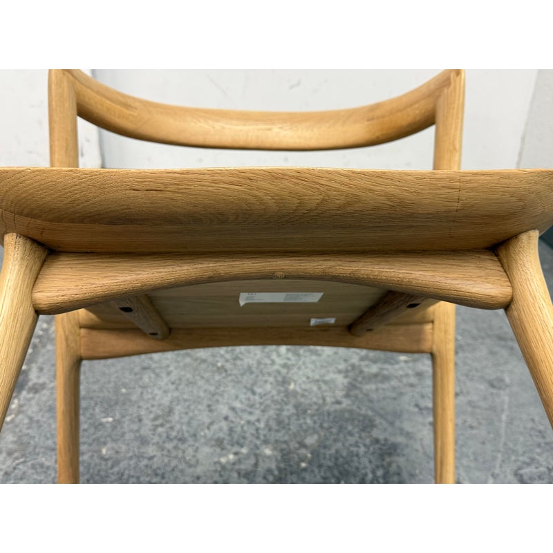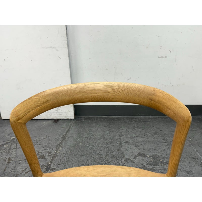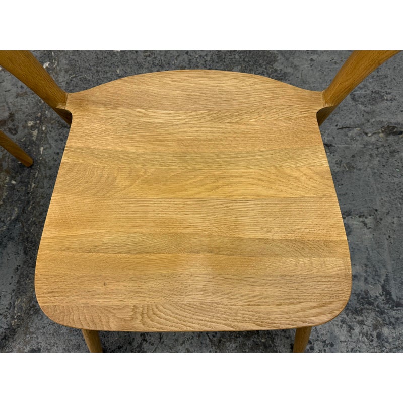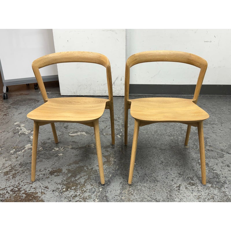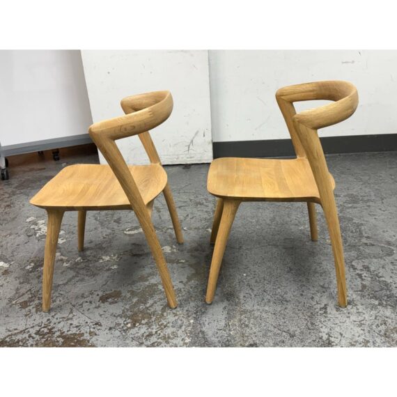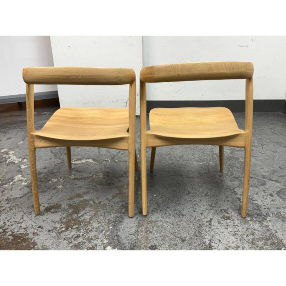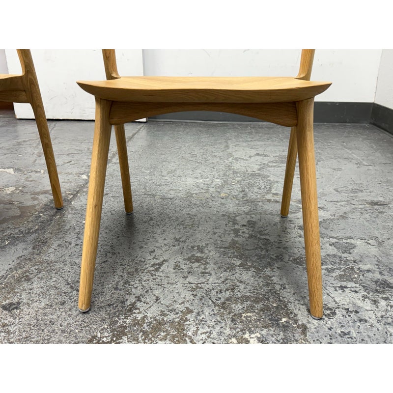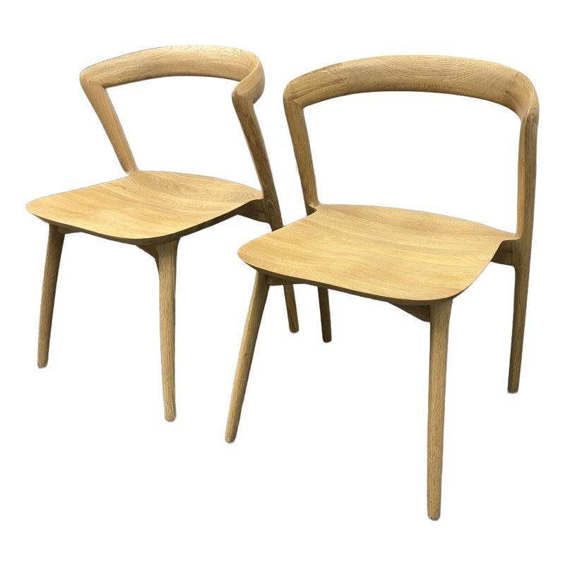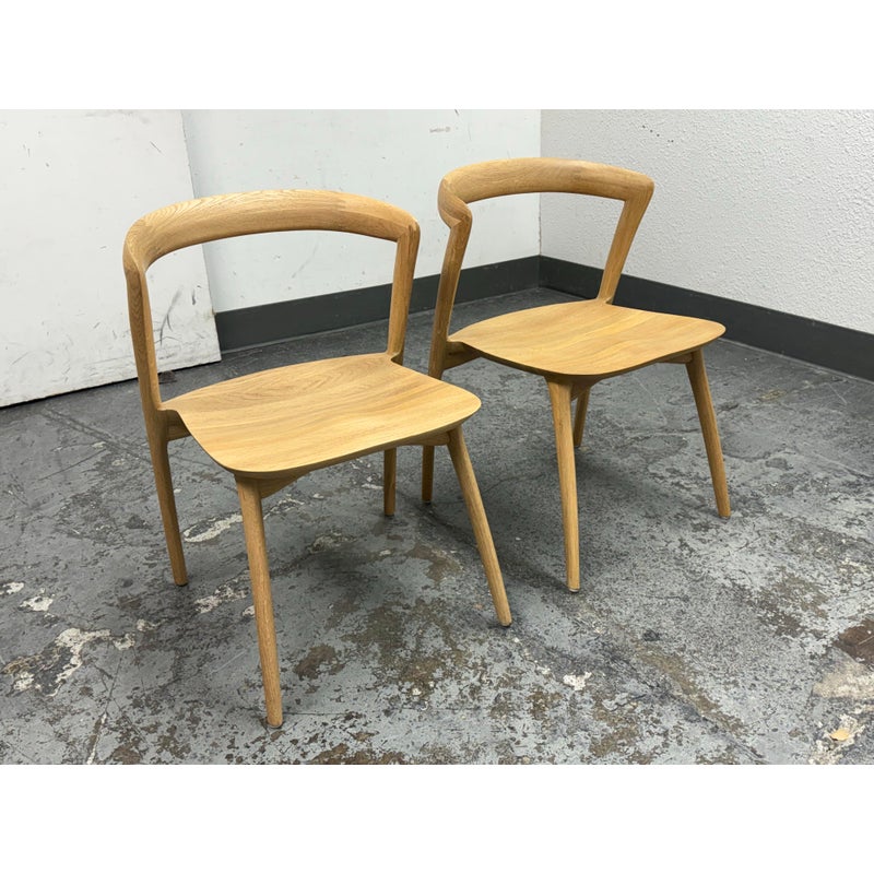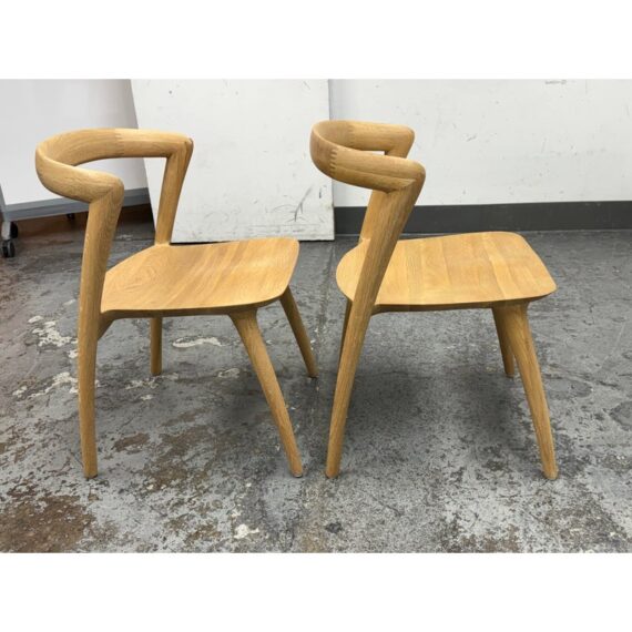 Design Plus Gallery presents a Pair of Light Oakwood Luka Side Dining Chairs, Designed by Charlie Hinckfuss for Restoration Hardware. Handcrafted of solid American oak with a curved back, contoured saddle seat and distinctive raked legs, the sculptural design offers a dynamic interplay between positive and negative space. Their style lays tribute to the craftsmanship and elegant, function-driven forms of Scandinavian Modern furnishings, a study in midcentury restraint. Both are in good condition with minimal wear for their usage.