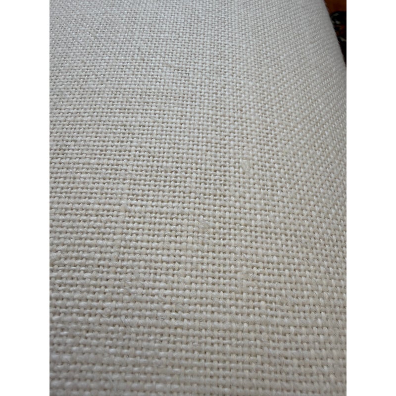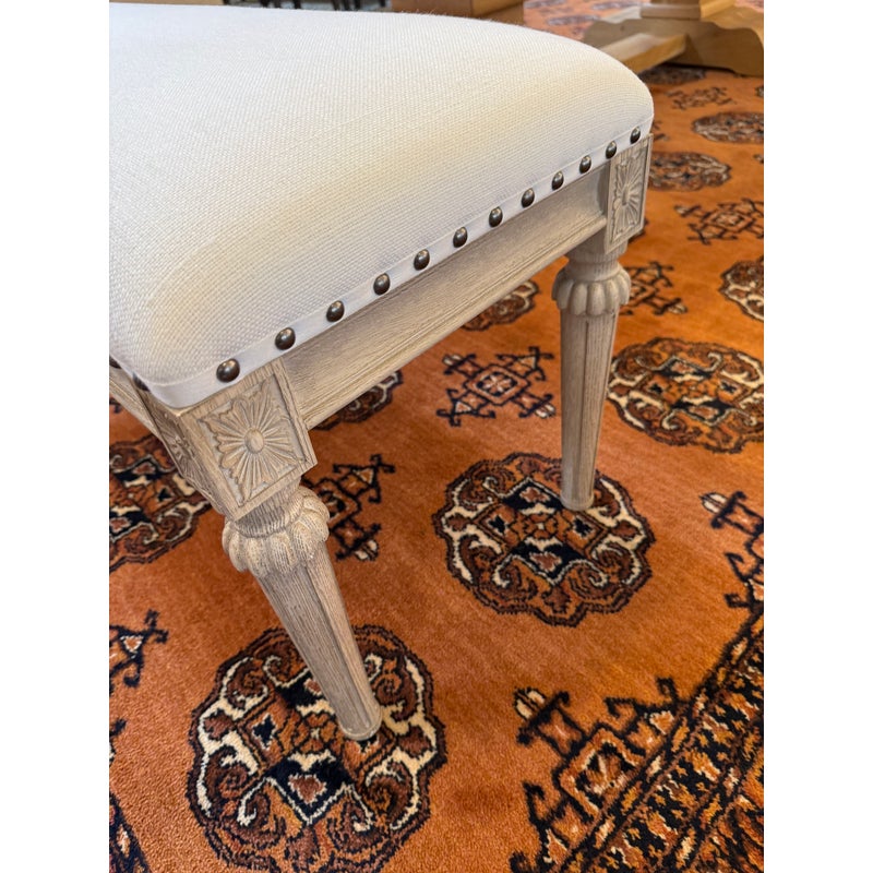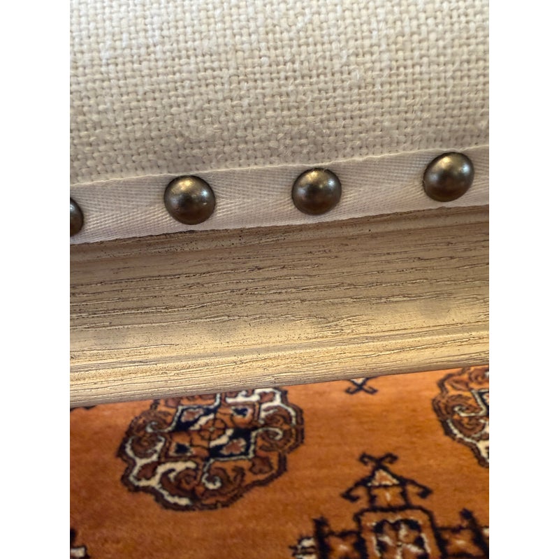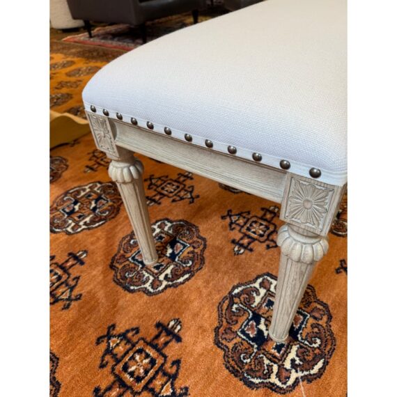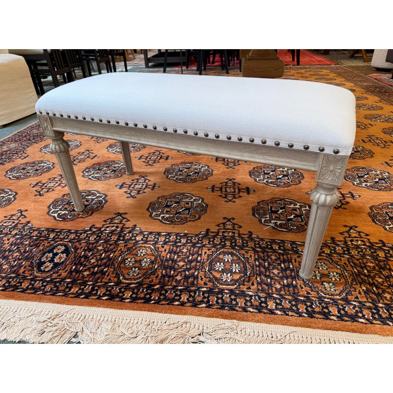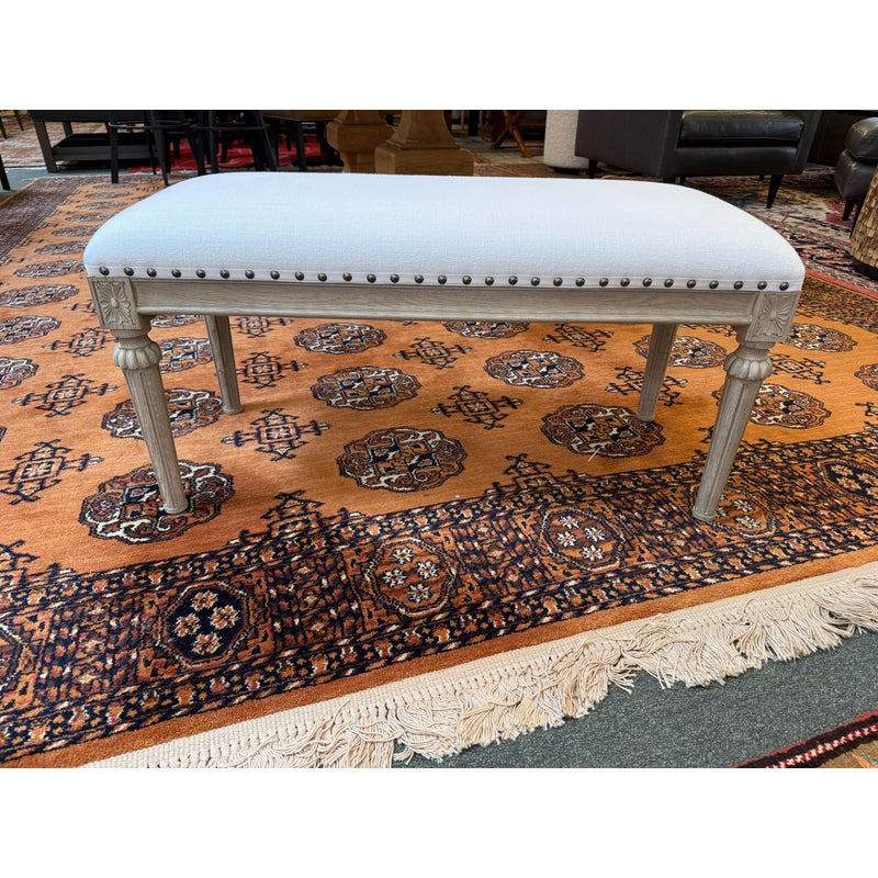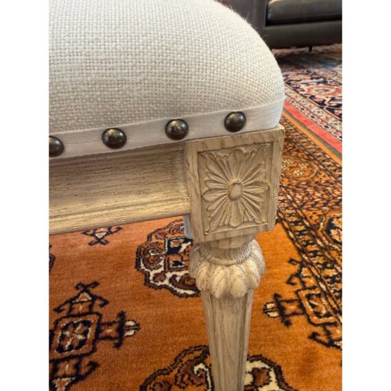 Design Plus Gallery presents a Maison Bench by Restoration Hardware. Drawing inspiration from late 18th-century French furnishings, we have meticulously captured the linearity and rectangular forms characteristic of that era. Crafted from lightly finished hardwood and richly upholstered in linen, the elegant bench has careful distressing to emulate the appearance of a weathered antique. Detailed with antiqued silver nailheads. The tapered, slightly turned legs are fluted, a nod to Classic columns. Light wear; condition is good.