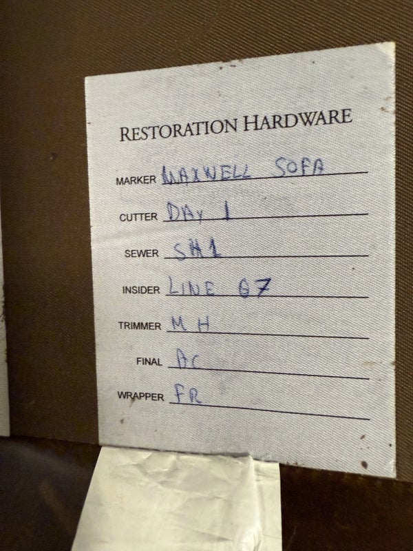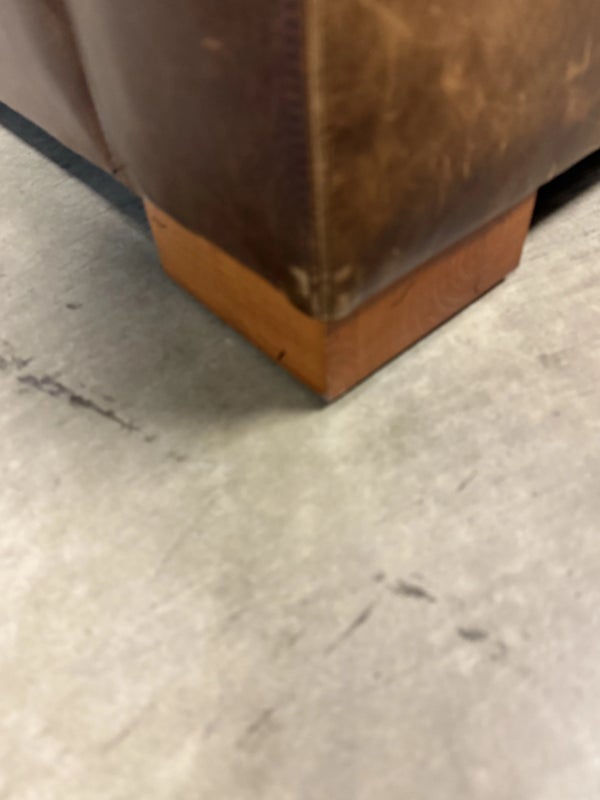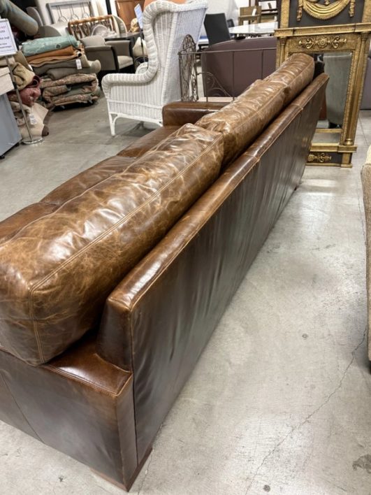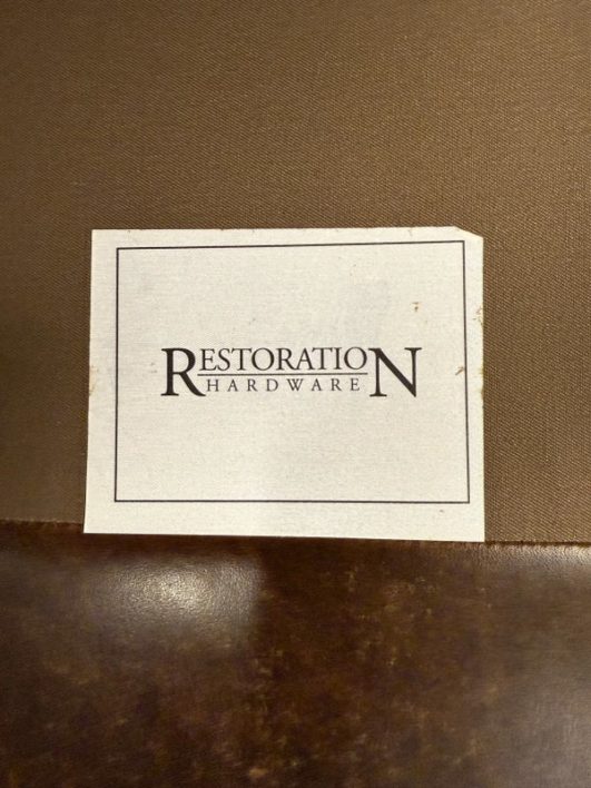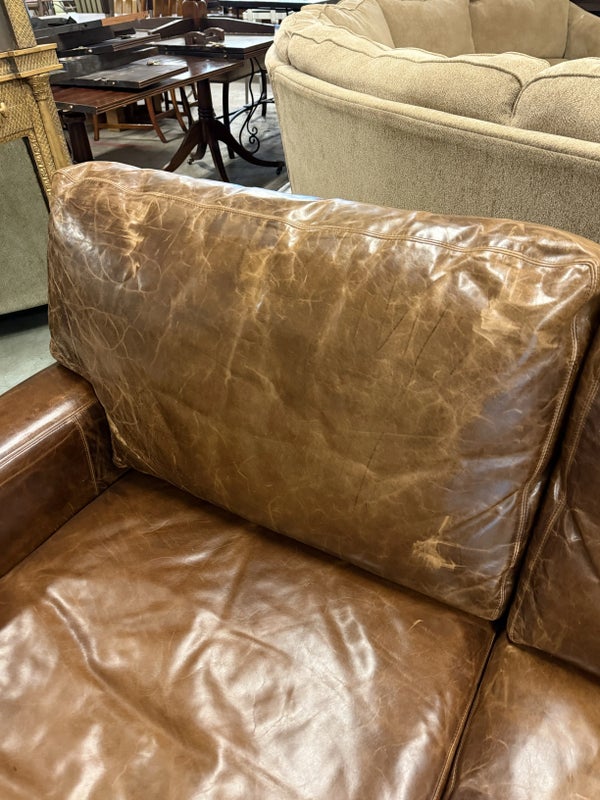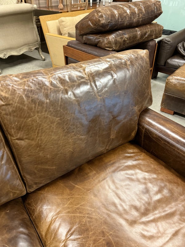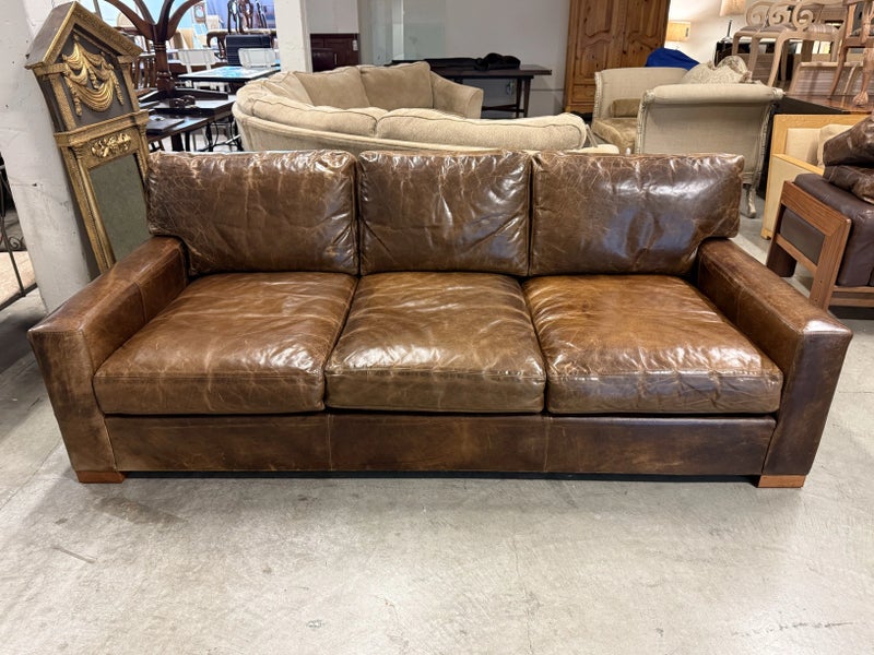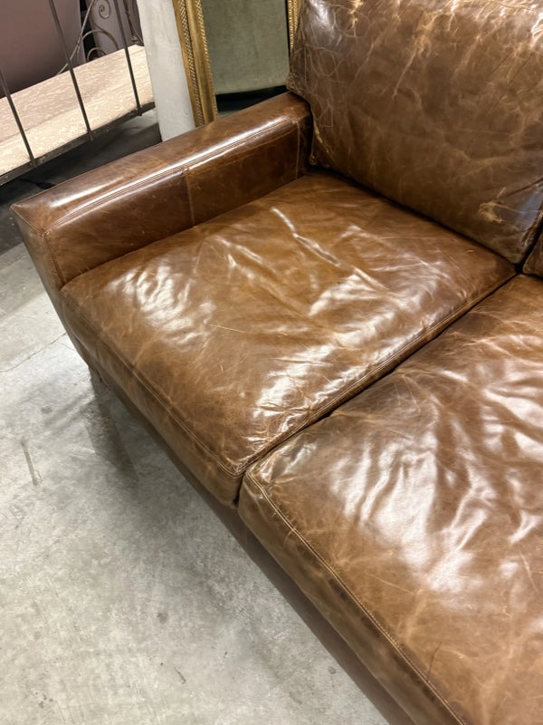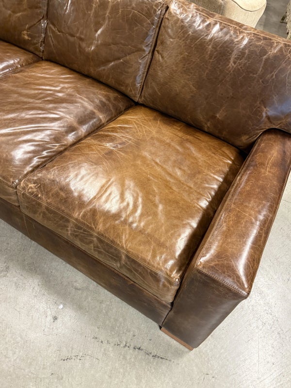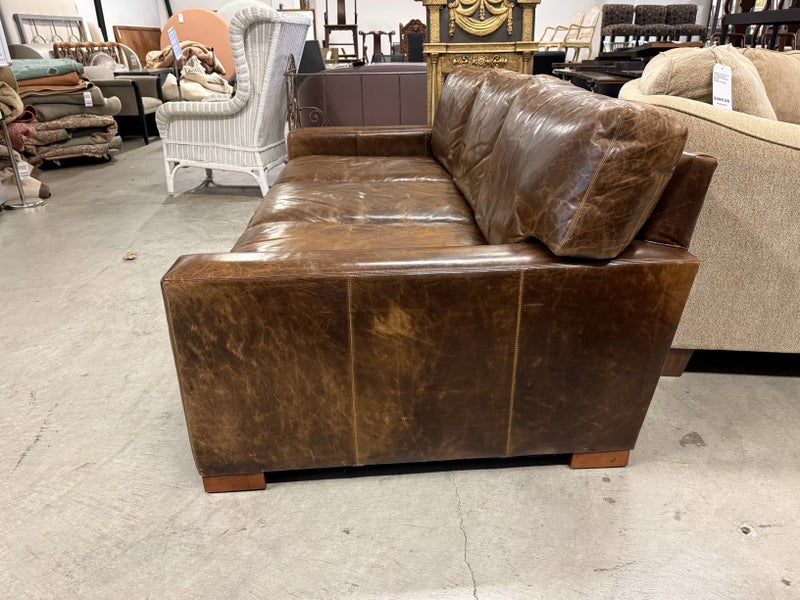 Design Plus Gallery presents the Maxwell Apartment Sofa from Restoration Hardware. The loveseat/petite sofa is in their Luxe depth, nice deep for lounging into as ultra-deep proportions meet supreme comfort. Architectural and modernist, its low-slung profile and broad track arms invite are all designed for a superior sitting experience. Guaranteed for life. The brown leather is in Cocoa from their Italian leather Brompton collectionThe sofa has wear that is considered to be good and consistent with its usage.