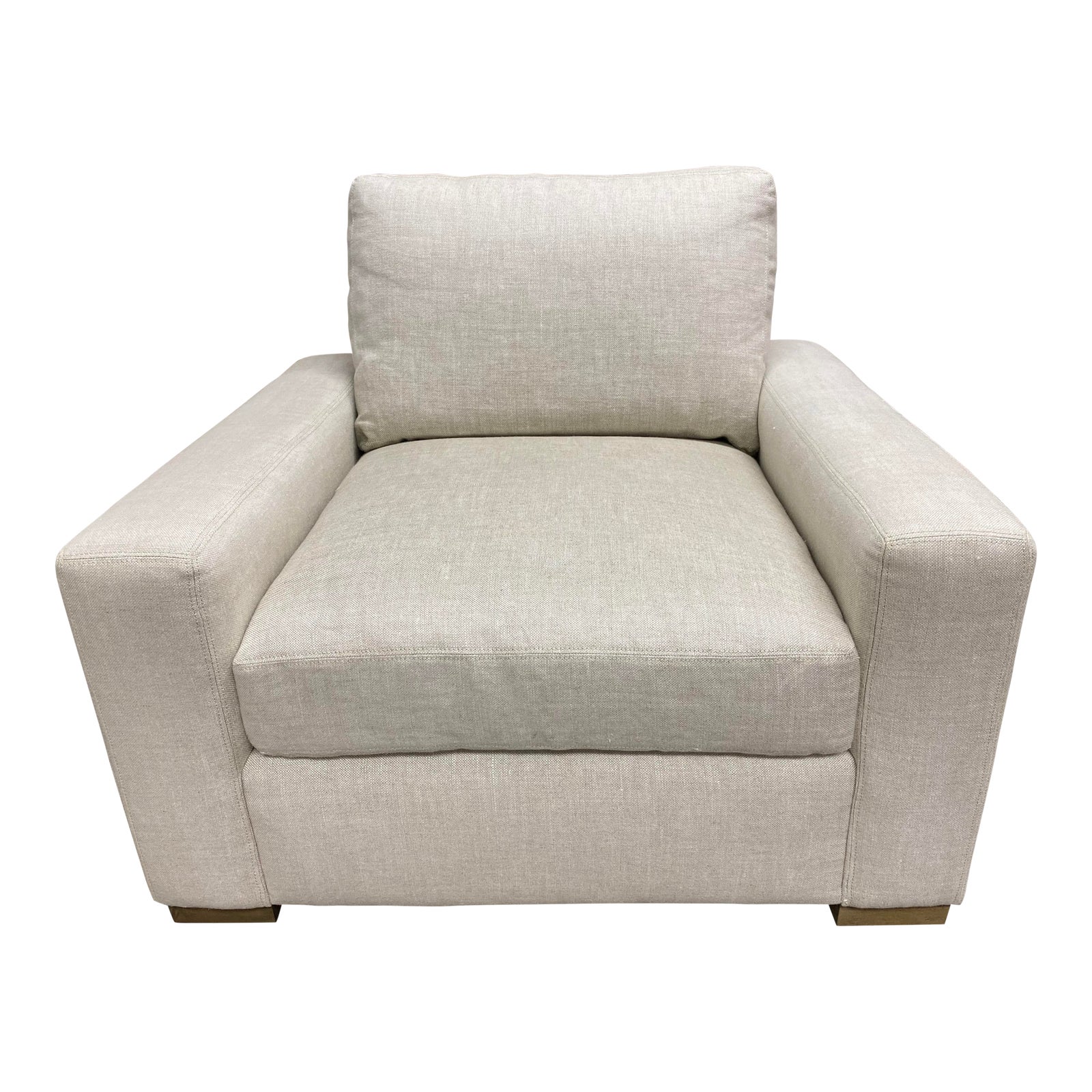 Design Plus Gallery presents a Restoration Hardware Maxwell Arm Chair. Sublime minimalism meets supreme comfort in the Maxwell Chair. Clean lines and a streamlined silhouette define its architectural attitude, while sumptuously padded cushions play plush counterpoint. The modernist, low-slung profile and broad track arms invite lounging. Kiln dried frame sits atop oak feet. Upholstered in a Perennials performance graded linen. Minor wear.