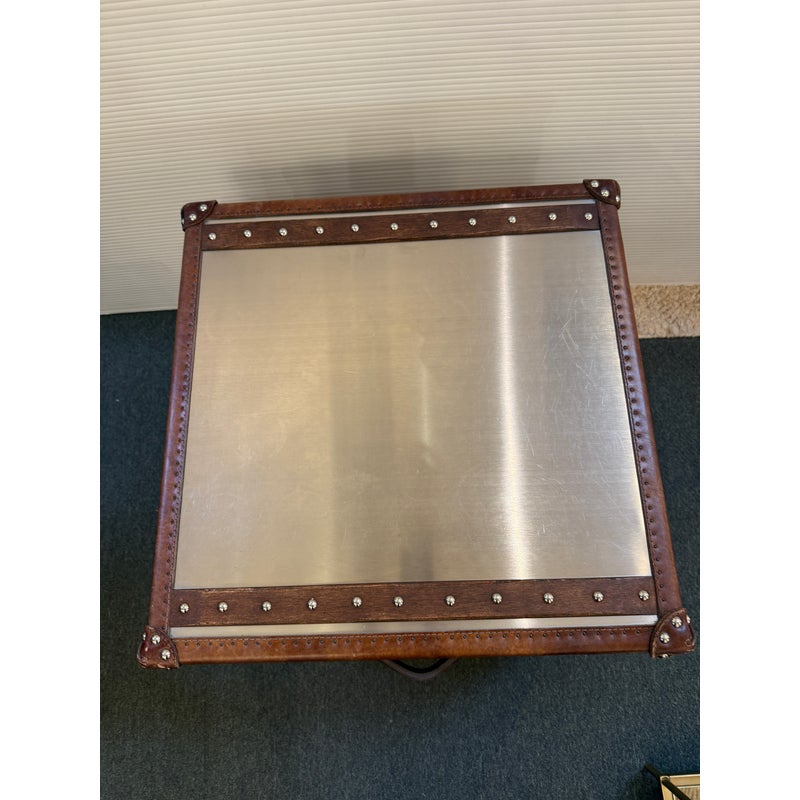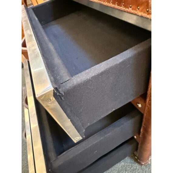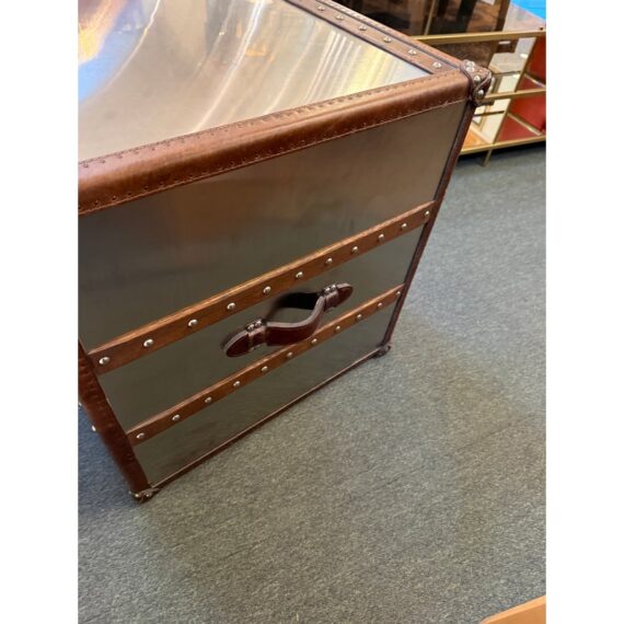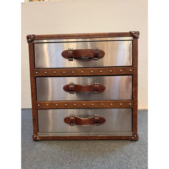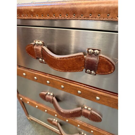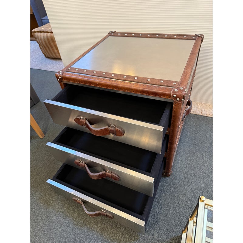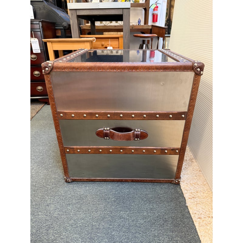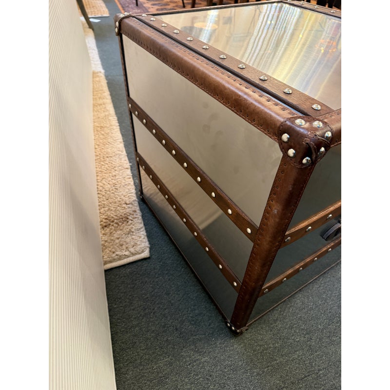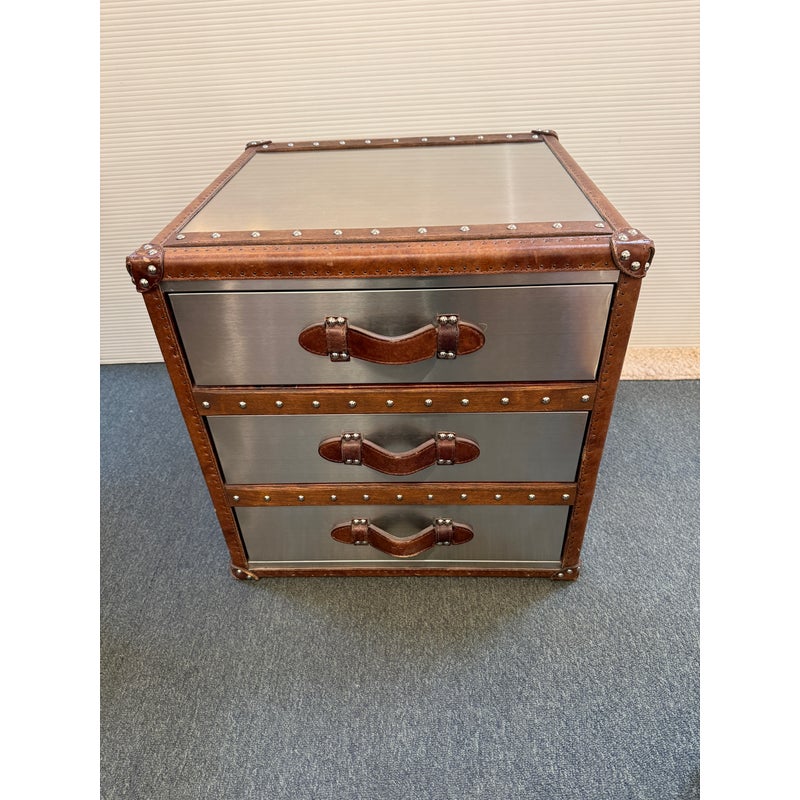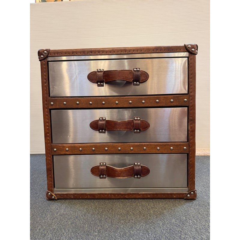 Design Plus Gallery presents a Mayfair Steamer Trunk 3-Drawer Cube from Restoration Hardware. With its brushed steel clad exterior, hand-hammered brass nailheads it looks ready for its voyage in your stylish room. Three canvas-lined drawers are smooth and effortless to open and are finished with leather-wrapped handles. This item is in good condition, visible and minimal surface wear that’s consistent with use.
