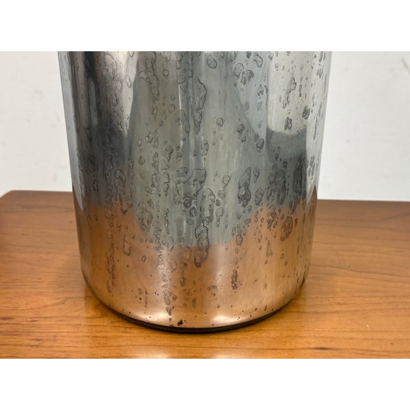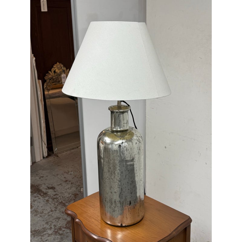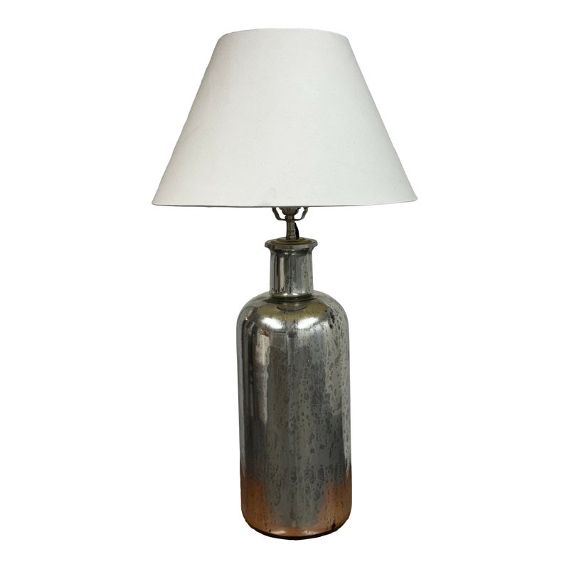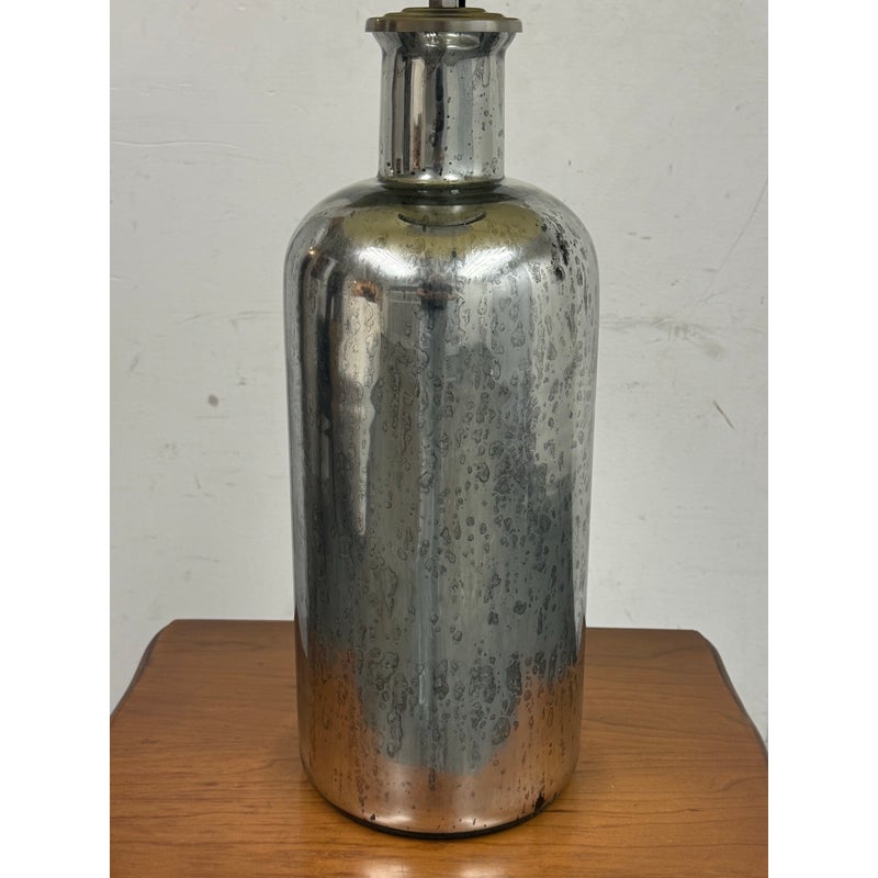 Design Plus Gallery presents the 19th Century Style Mercury Glass Table Lamp from Restoration Hardware. The shapely, silvery lamp was inspired by mid-19th-century mercury glass, once a covetable alternative to household sterling. Originally vessels for essential oils and perfumes, the vintage bottles we’ve repurposed have been given a distressed patina for an authentic timeworn appearance. Their style of lamp like these are all now discontinued and this is in good overall condition. Made in India.