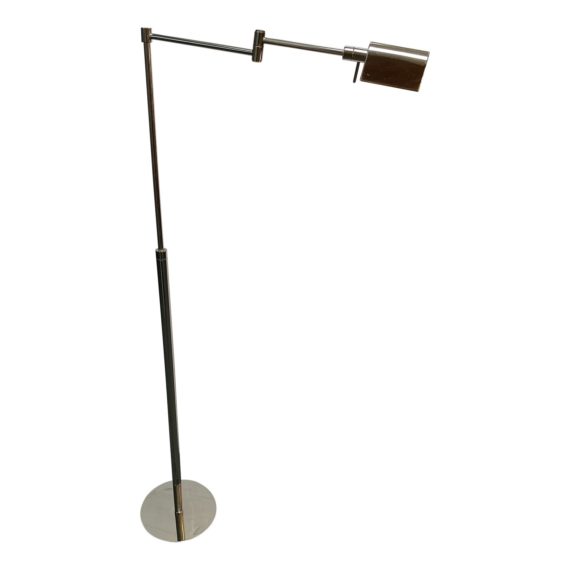 Design Plus Gallery presents a Metier Task Floor Lamp by Restoration Hardware. The body is constructed with steel and given a polished nickel finish. It has a swivel arm that glides for optimal positioning. The shade is triangular and can rotate. Minor wear consistent with use; floor lamp is in good condition.