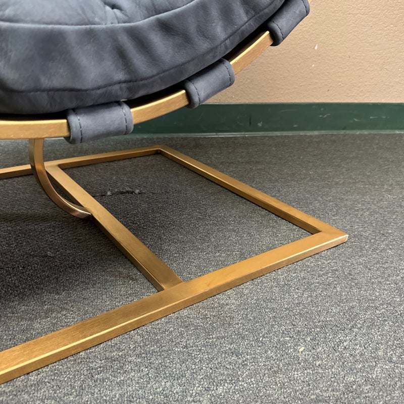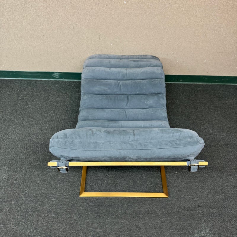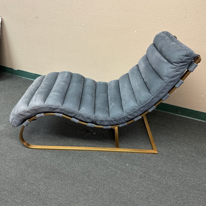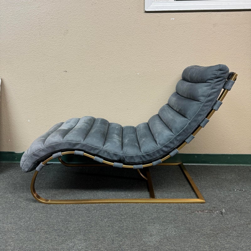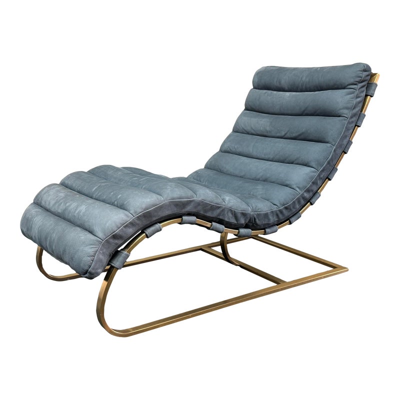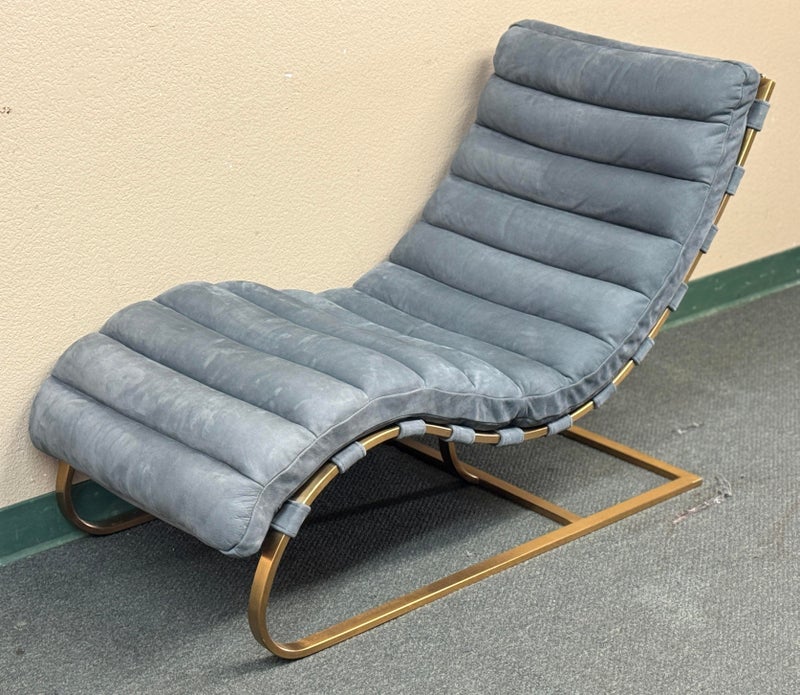 Design Plus Gallery presents the Oviedo Chaise by Restoration Hardware. An edgy combination of cantilevered brushed brass and suede leather. The channel-stitched, upholstered poly-fillseat cushion, wrapped in mottled blue leather, is all about comfort and style in one. Light surface wear; condition is consistent with age and use
