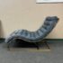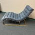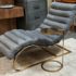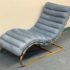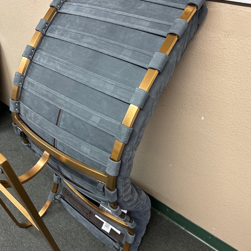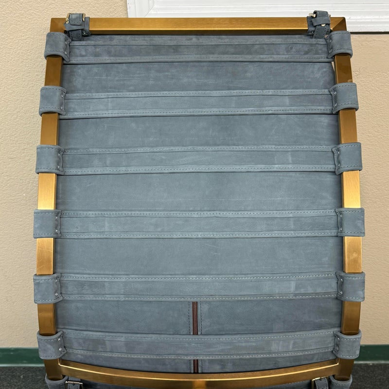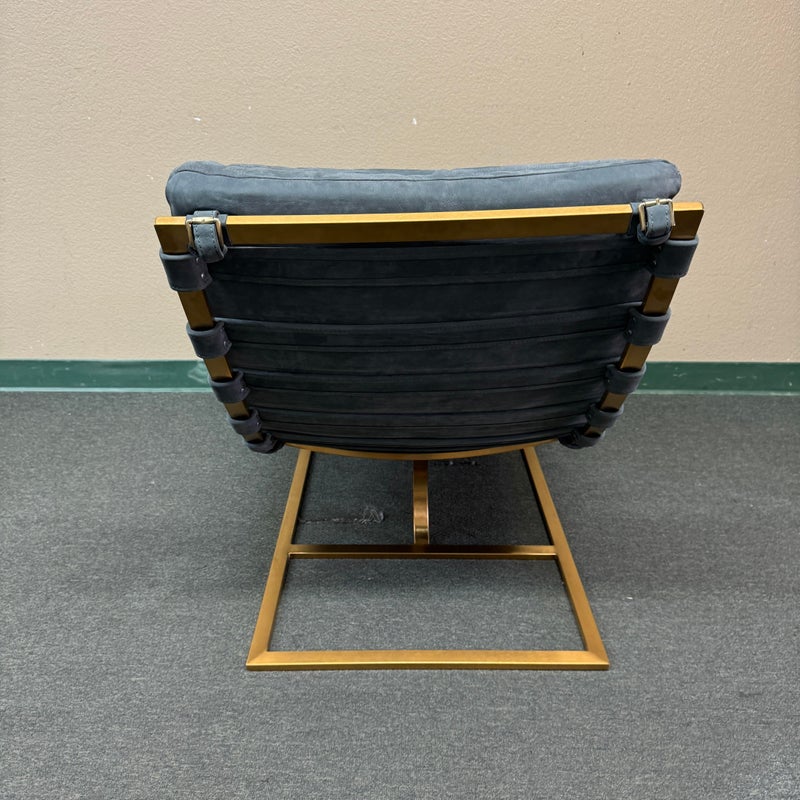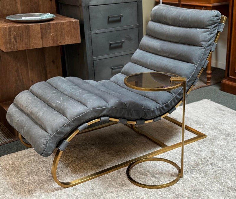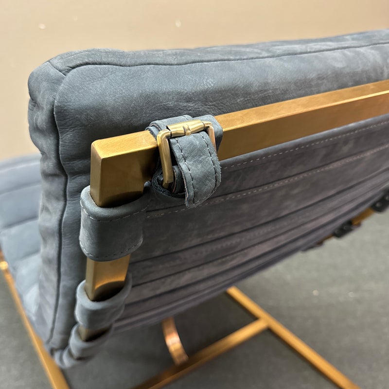 Design Plus Gallery presents the Oviedo Chaise by Restoration Hardware. An edgy combination of cantilevered brushed brass and suede leather. The channel-stitched, upholstered poly-fillseat cushion, wrapped in mottled blue leather, is all about comfort and style in one. Light surface wear; condition is consistent with age and use