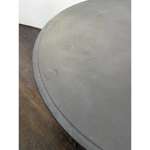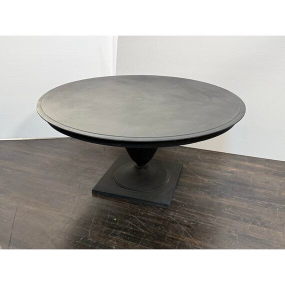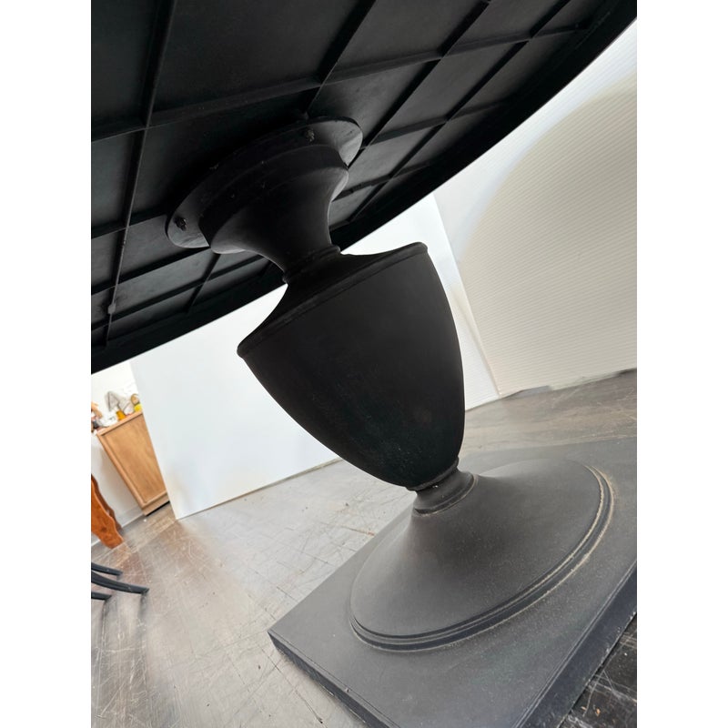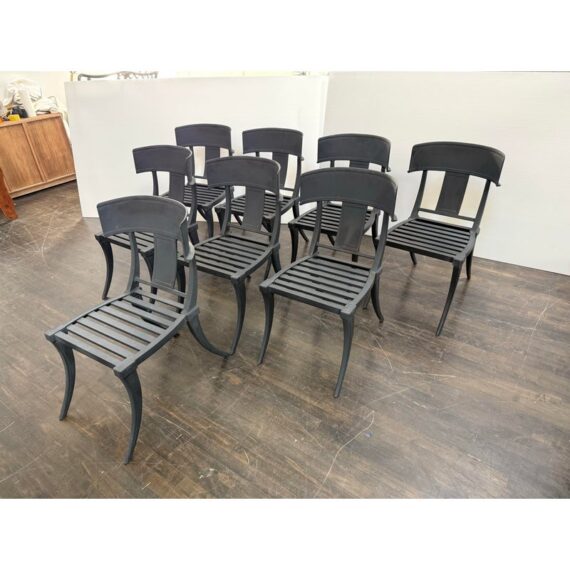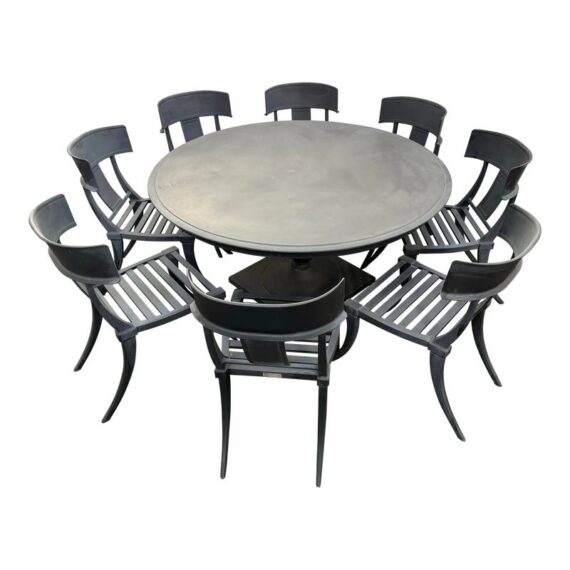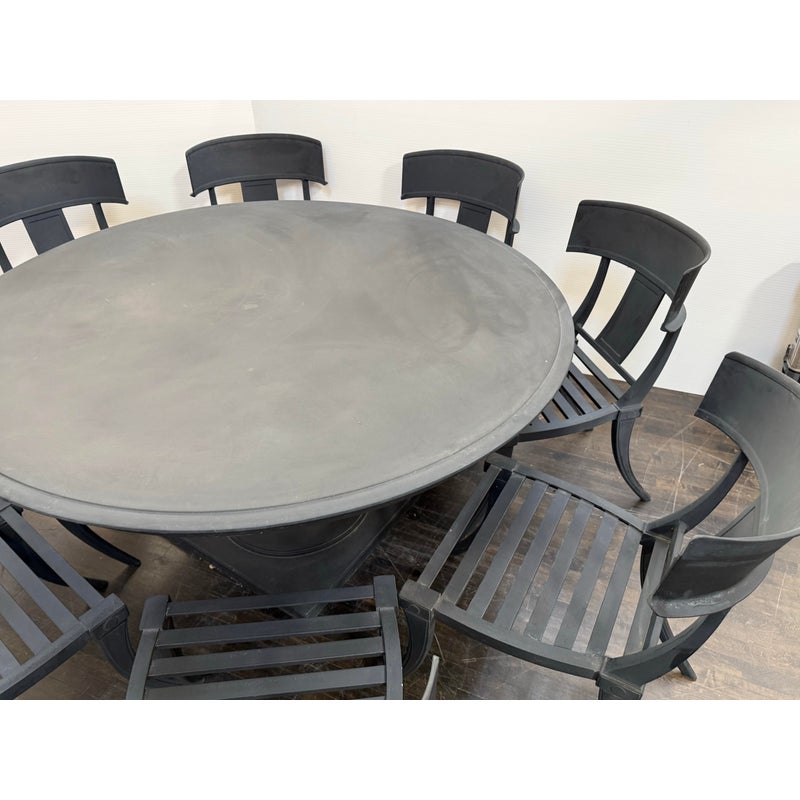 Design Plus Gallery presents the Klismos Outdoor Pedestal Table + Eight Klismos Chairs from Restoration Hardware. Inspired by 5th century B.C. Greek design, the Klismos collection is known for graceful lines and classical relief detailing. This outdoor dining set is made of all-weather cast aluminum and includes a round pedestal table with an urn-form base and eight matching Klismos dining chairs. Visible patina from usage is present throughout. The seat cushions show wear and would benefit from replacement. They are in good condition with visible and minimal wear from usage.