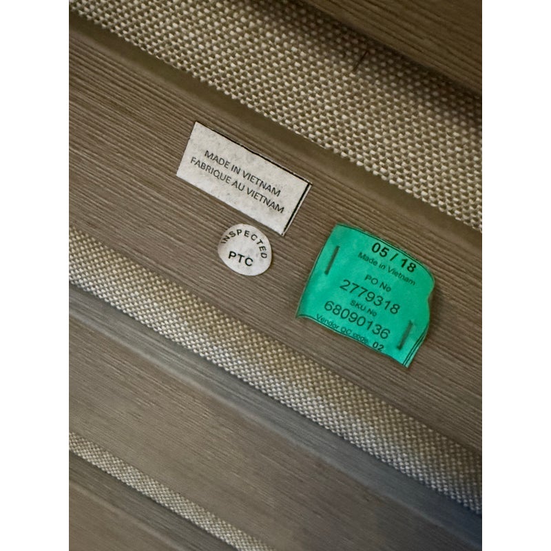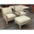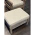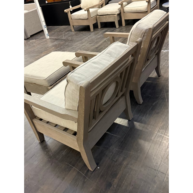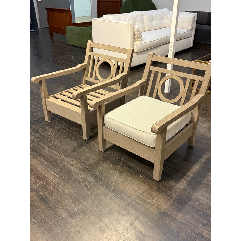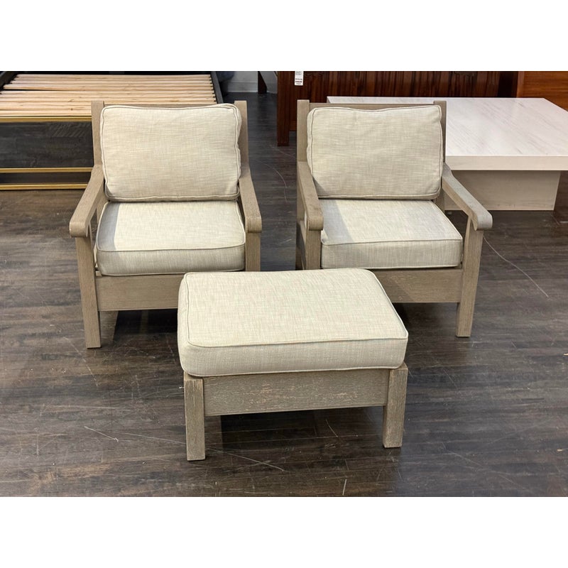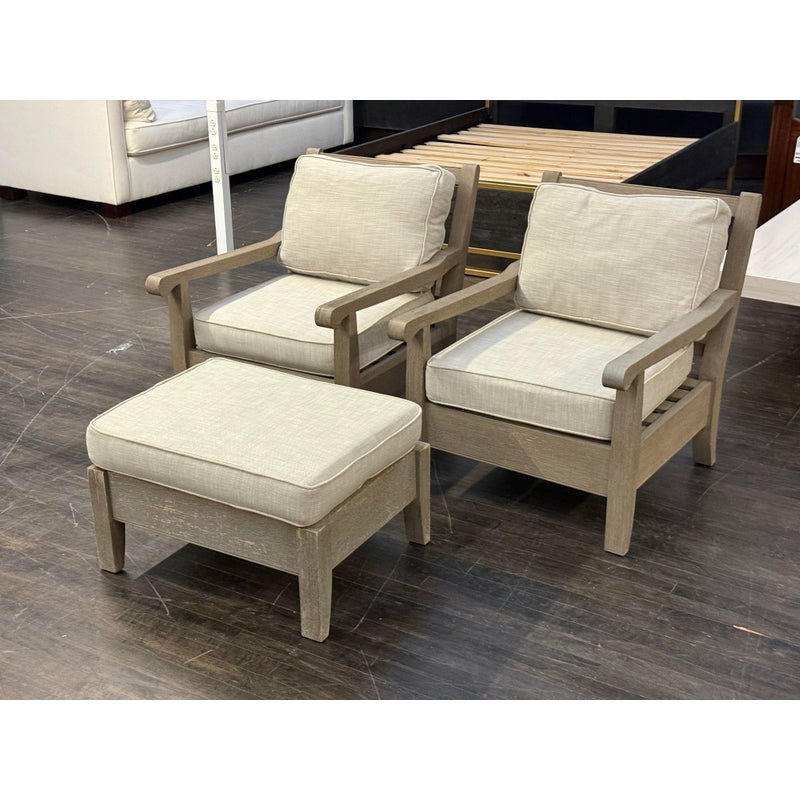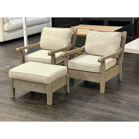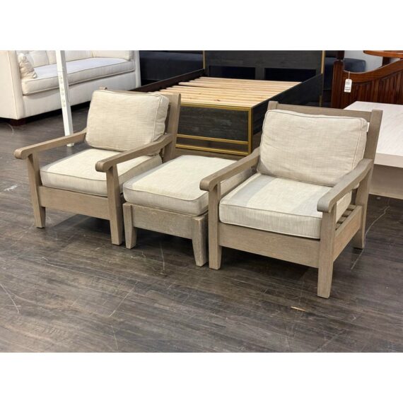 Design Plus Gallery presents a Pair of Leagrave Lounge Chairs + Ottoman From Restoration Hardware. The coordinated seating set showcases clean-lined wooden frames with a soft gray-toned stain. The chairs are designed with wide arms, a solid stance, and generously proportioned cushions upholstered in a neutral woven textile that can withstand outdoor elements. The ottoman mirrors the same construction and upholstery, creating a cohesive and balanced look across the set. The combination of structured woodwork and tailored cushioning results in a timeless, understated aesthetic with an emphasis on comfort and proportion. They are in good condition with visible and minimal wear from usage.