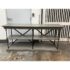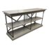 Design Plus Gallery presents a Parisian Cornice Console Table from Restoration Hardware. Channels the late-20th-century postmodern spirit, uniting pared-down modernism with classical architectural references. A reproduction of a French original, it balances clean lines with a refined, cornice-inspired profile, creating a piece that feels both timeless and contemporary. Features a gray finish with natural distress from use, adding character and a lived-in patina. A sturdy metal frame supports wood shelves, offering open, versatile storage and display. This is a discontinued model. In good condition, visible and minimal wear from usage.