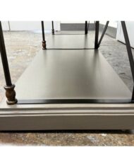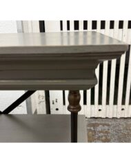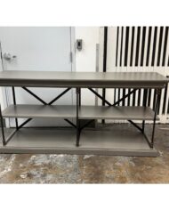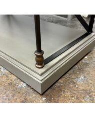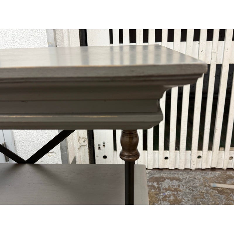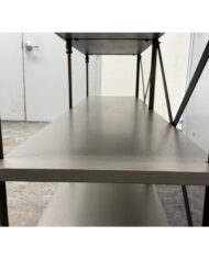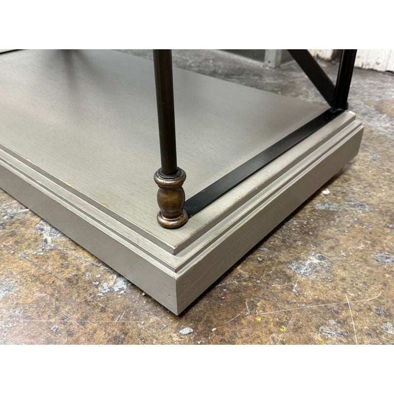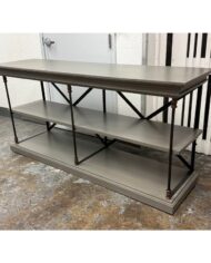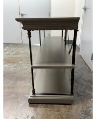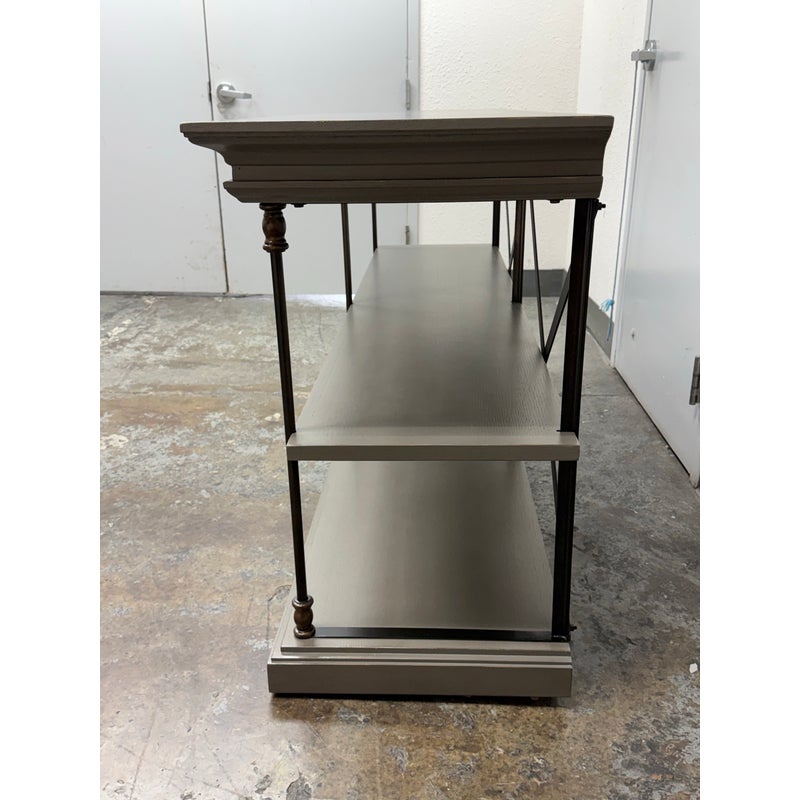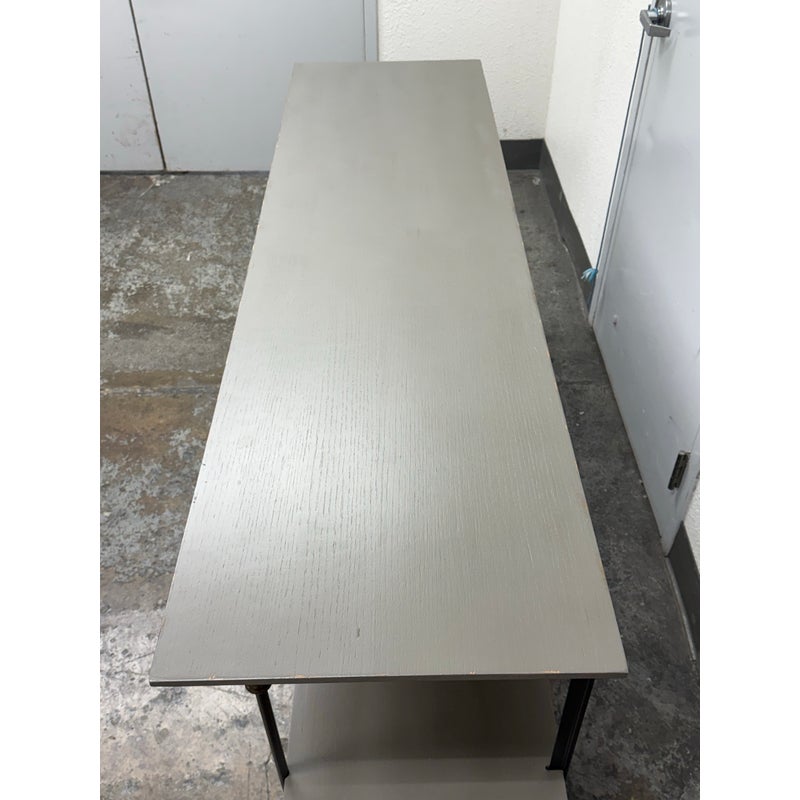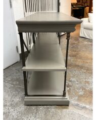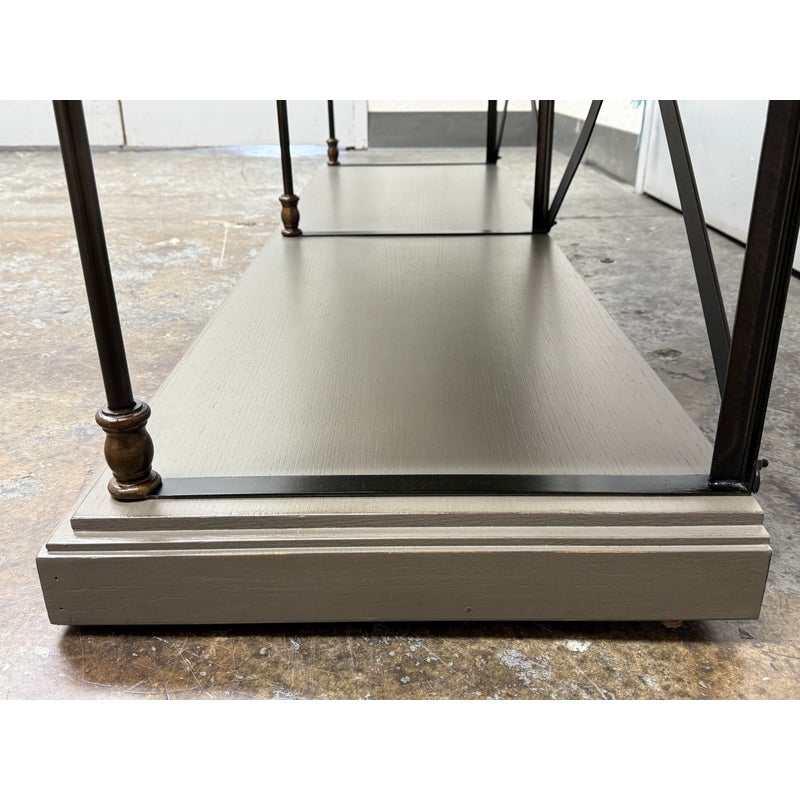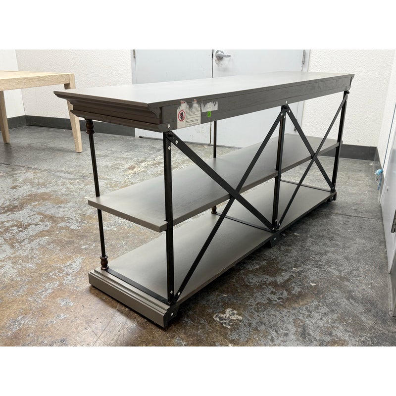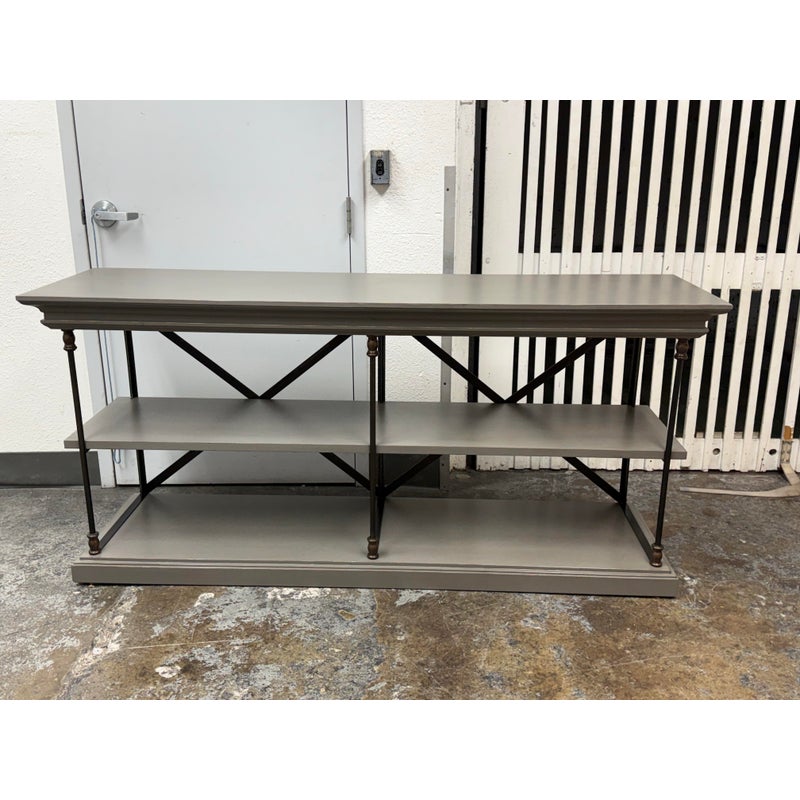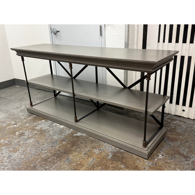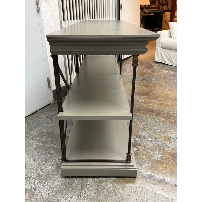 Design Plus Gallery presents a Parisian Cornice Console Table from Restoration Hardware. Channels the late-20th-century postmodern spirit, uniting pared-down modernism with classical architectural references. A reproduction of a French original, it balances clean lines with a refined, cornice-inspired profile, creating a piece that feels both timeless and contemporary. Features a gray finish with natural distress from use, adding character and a lived-in patina. A sturdy metal frame supports wood shelves, offering open, versatile storage and display. This is a discontinued model. In good condition, visible and minimal wear from usage.