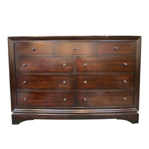 Design Plus Gallery presents the Portman Dresser by Restoration Hardware. This transitional dresser, with a light touch touch of traditional, shows fine craftsmanship in its dove tail joinery and “aged” finish. Nine cedar-lined drawers have cast brass pulls. Light surface conditions