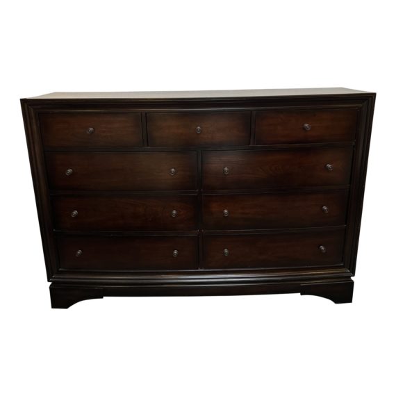 Design Plus Gallery presents the Portman Dresser by Restoration Hardware. This transitional dresser, with a light touch touch of traditional, shows fine craftsmanship in its dove tail joinery and “aged” finish. Nine cedar-lined drawers have cast brass pulls. Light surface conditions