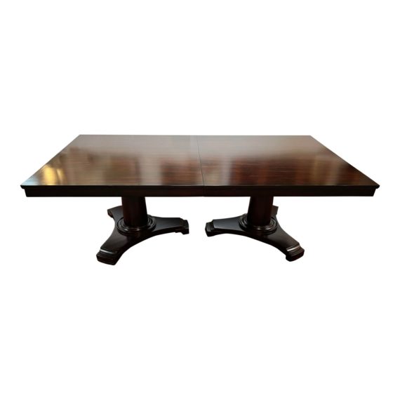 Design Plus Gallery presents a Restoration Hardware Portman Rectangle Extensions Dining Table. Reminiscent of a beloved Farmhouse Table. Flexibility with leafs gives the availability to seat up to eight. Two pedestal bases gives ample support to the expansive and rich table while freeing up leg space for an open and airy look. There is minor wear through out, dining table is in good condition. Style has been discontinued by Restoration Hardware.