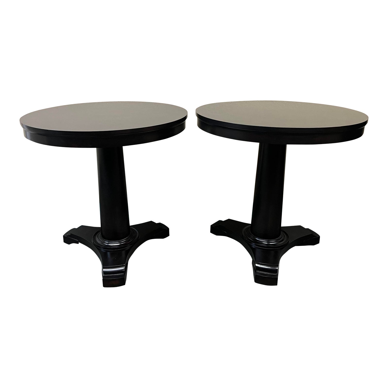 Design Plus Gallery present a Pair of Portman Side Tables by Restoration Hardware. Classic in silhouette, the pedestal table has a lighter presence, even with the rich dark finish. Surfaces have visible wear, as shown in photo.
