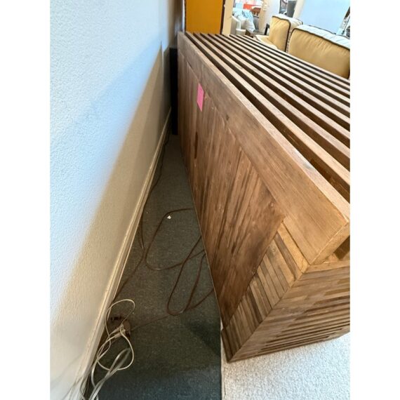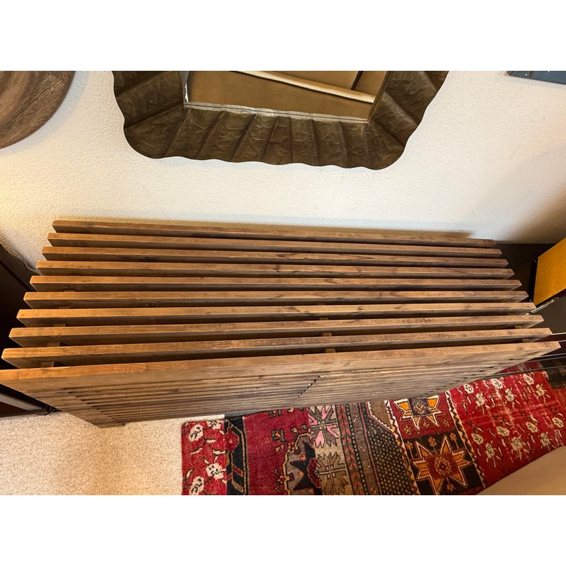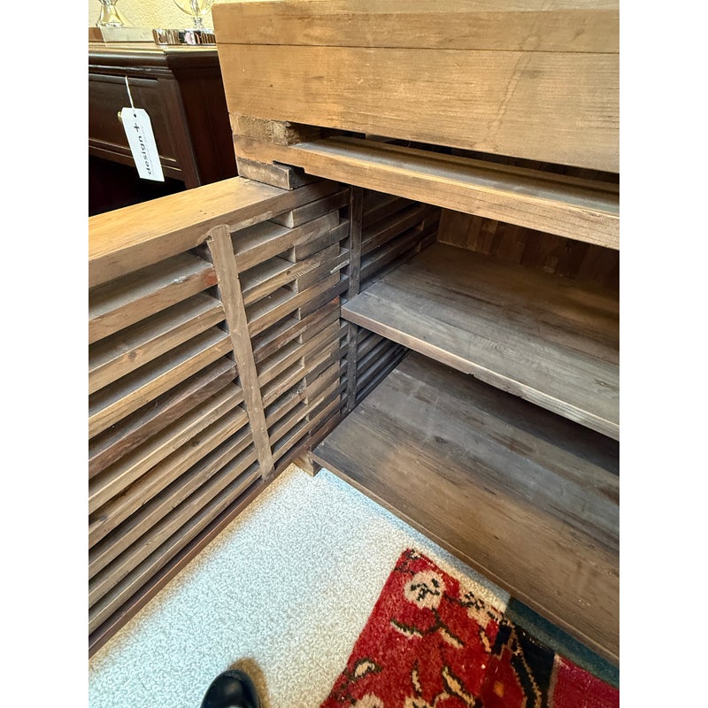 Design Plus Gallery presents a Slatted Sideboard from Restoration Hardware. The striking slatted design is smooth to the touch but retains its distinctive nicks, knots and woodgrain imperfections. The pair of doors open to an expanse of shelf storage. An eco-friendly dream piece of furniture as the wood to create this piece came from salvaged timber. Light wear through out, cabinet sideboard is in good condition.