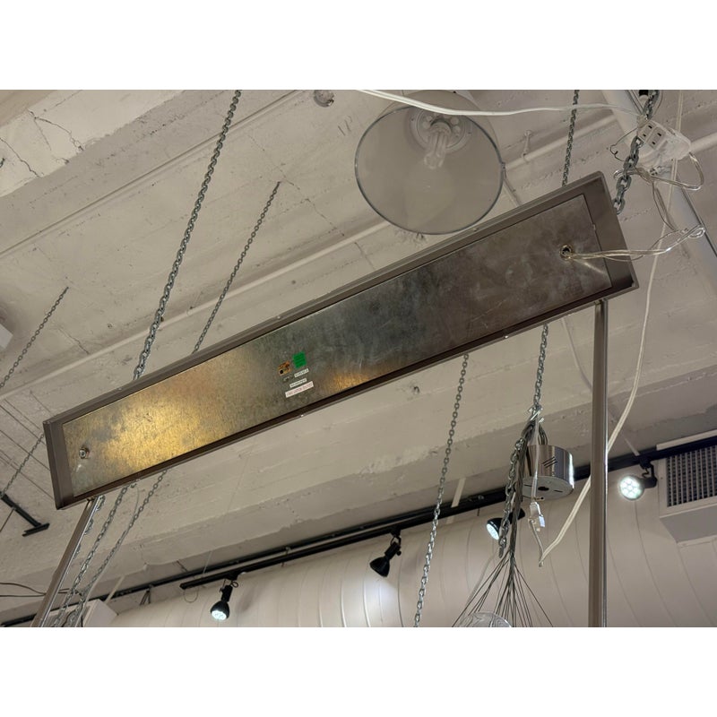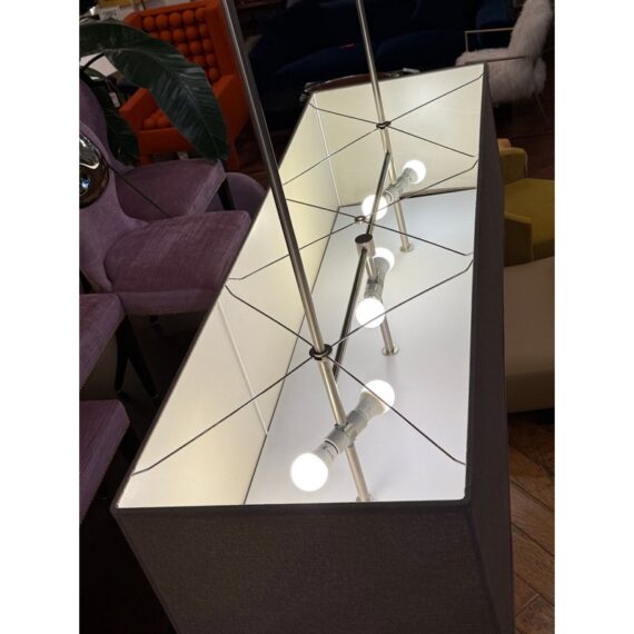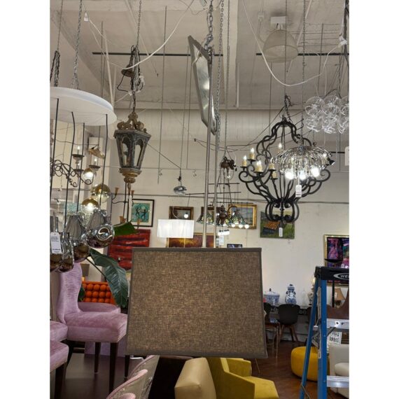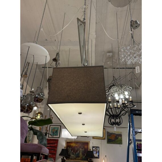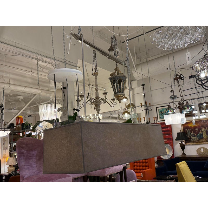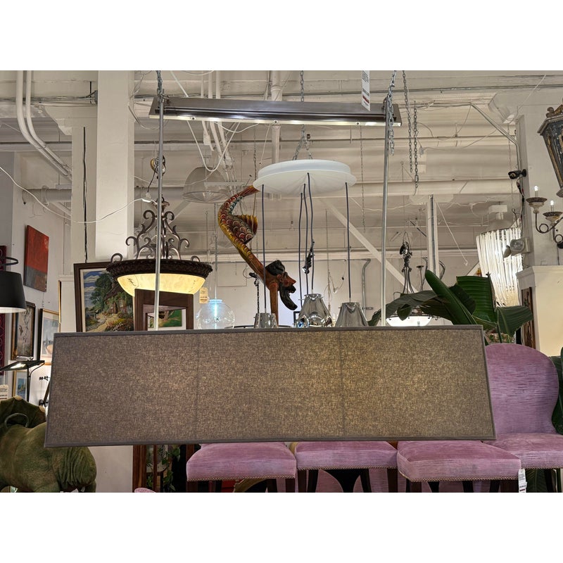 Design Plus Gallery presents a Rectangular Ceiling Pendant from Restoration Hardware. The style chandelier is perfect over a dining table or kitchen island as it softly diffuses light through its fabric + base mount for ideal conversation lighting. The tone is an easy match for any decor style. Is in good visible condition, currently missing ceiling mount.