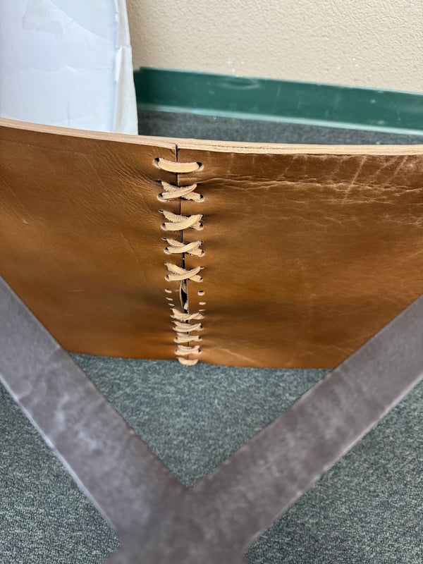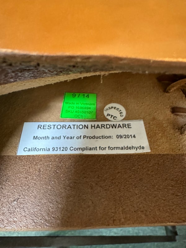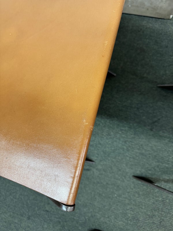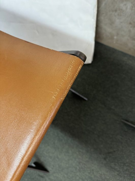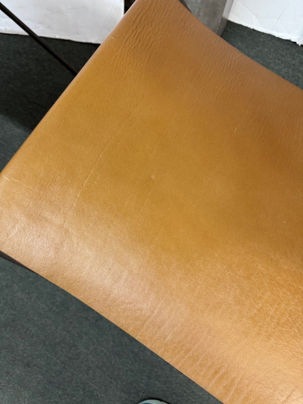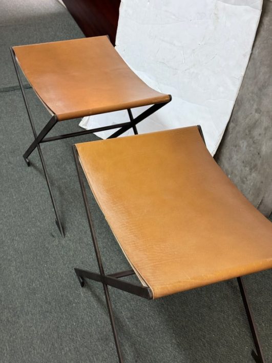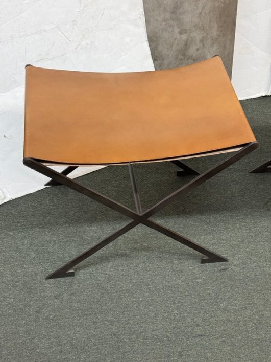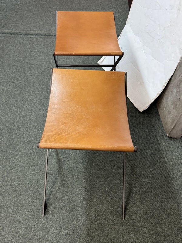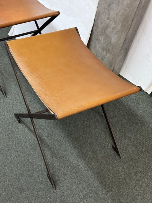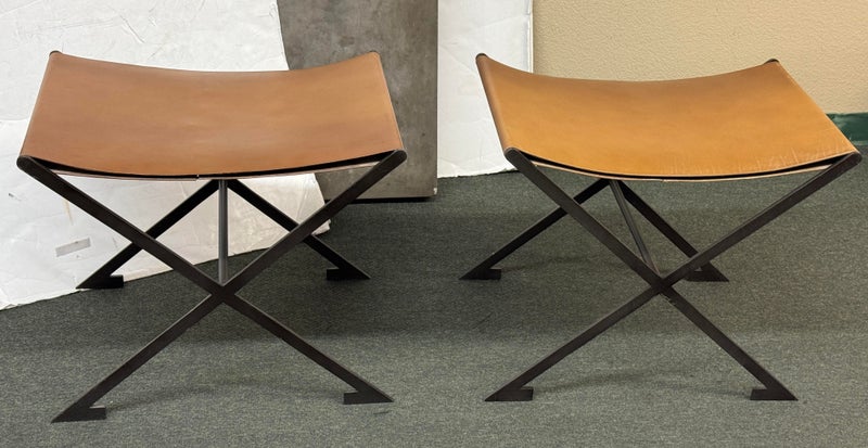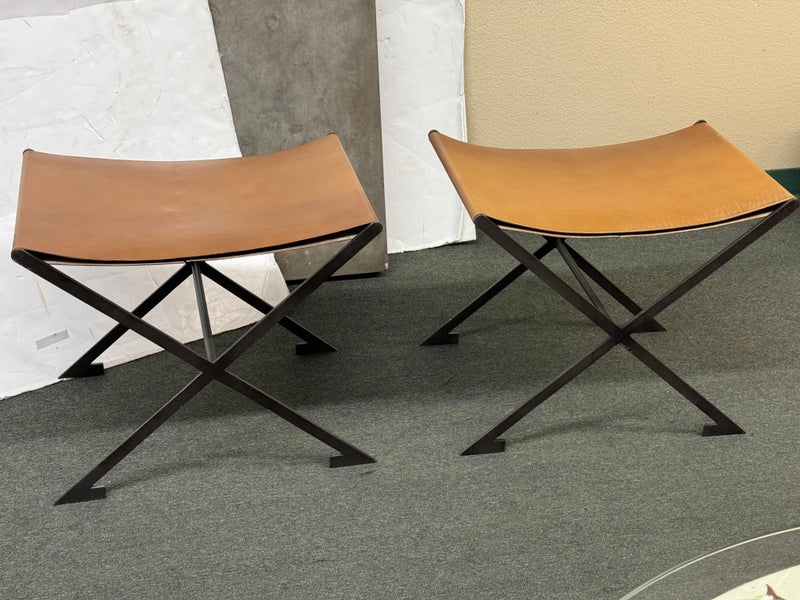 Design Plus Gallery presents a Pair of X-Frame Stools by Restoration Hardware. A stylish and versatile seating option for any space. Made with a sturdy steel metal frame, these stools feature a X-shaped design for added stability and visual interest. The cognac leather scoop seat adds a touch of sophistication and comfort to the stools. These stools are not only functional but also add a modern and chic touch to any space. The neutral color scheme makes them easy to pair with a variety of design styles and color palettes. Whether you need extra seating for guests or just want to add a stylish element to your space, these stools are a great choice. In good condition, visible and minimal wear from usage + age. This is a discontinued model. Made in Vietnam.