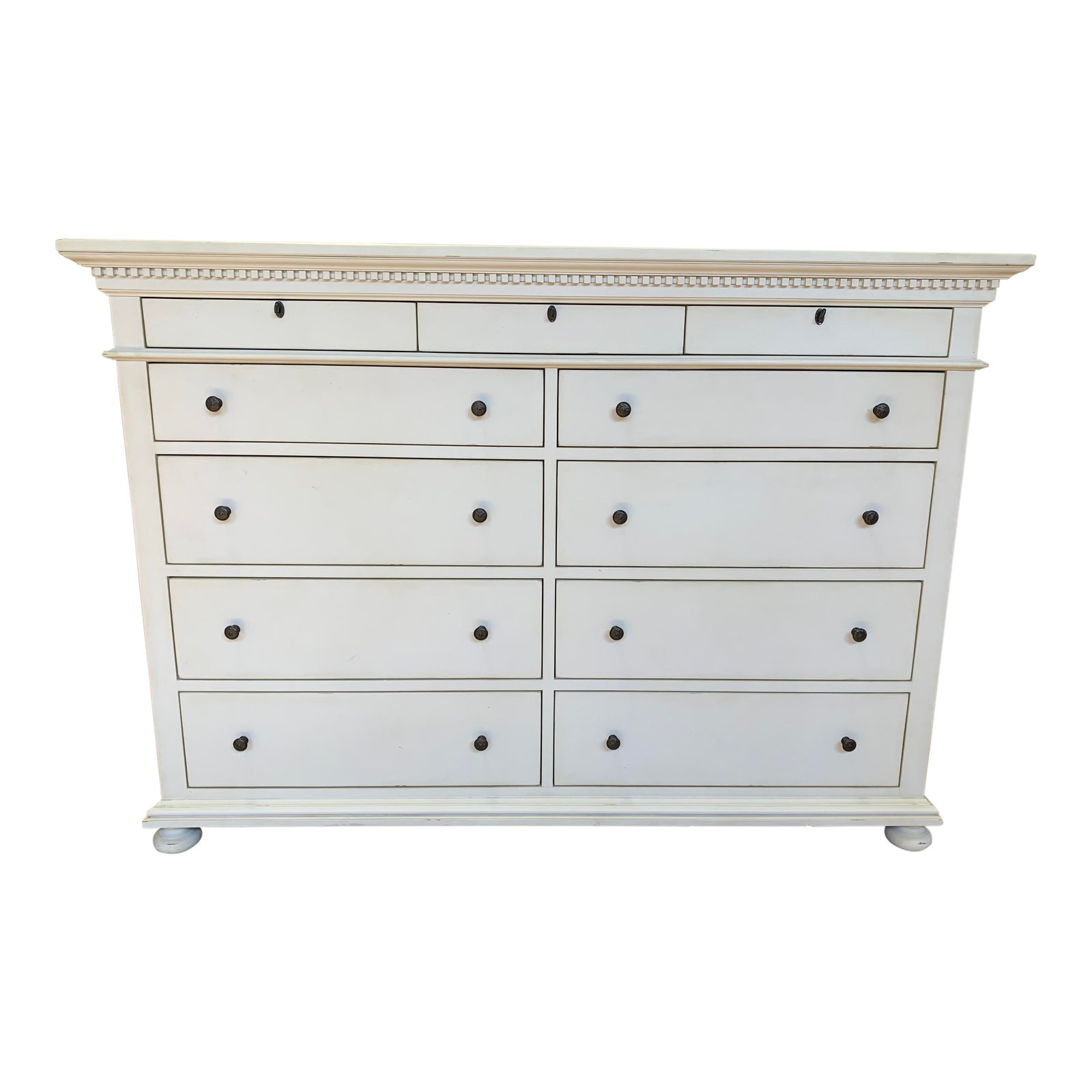Design Plus Gallery presents a Restoration Hardware St. James Eleven Drawer Dresser. Neo-classical details are combined with white conversion varnish for this generous storage piece. Minor wear on frame and one broke panels underneath. Oiled brass hardware completes this timeless look, complete with keys and locks for the top row of drawers. The finish is an Antique White.