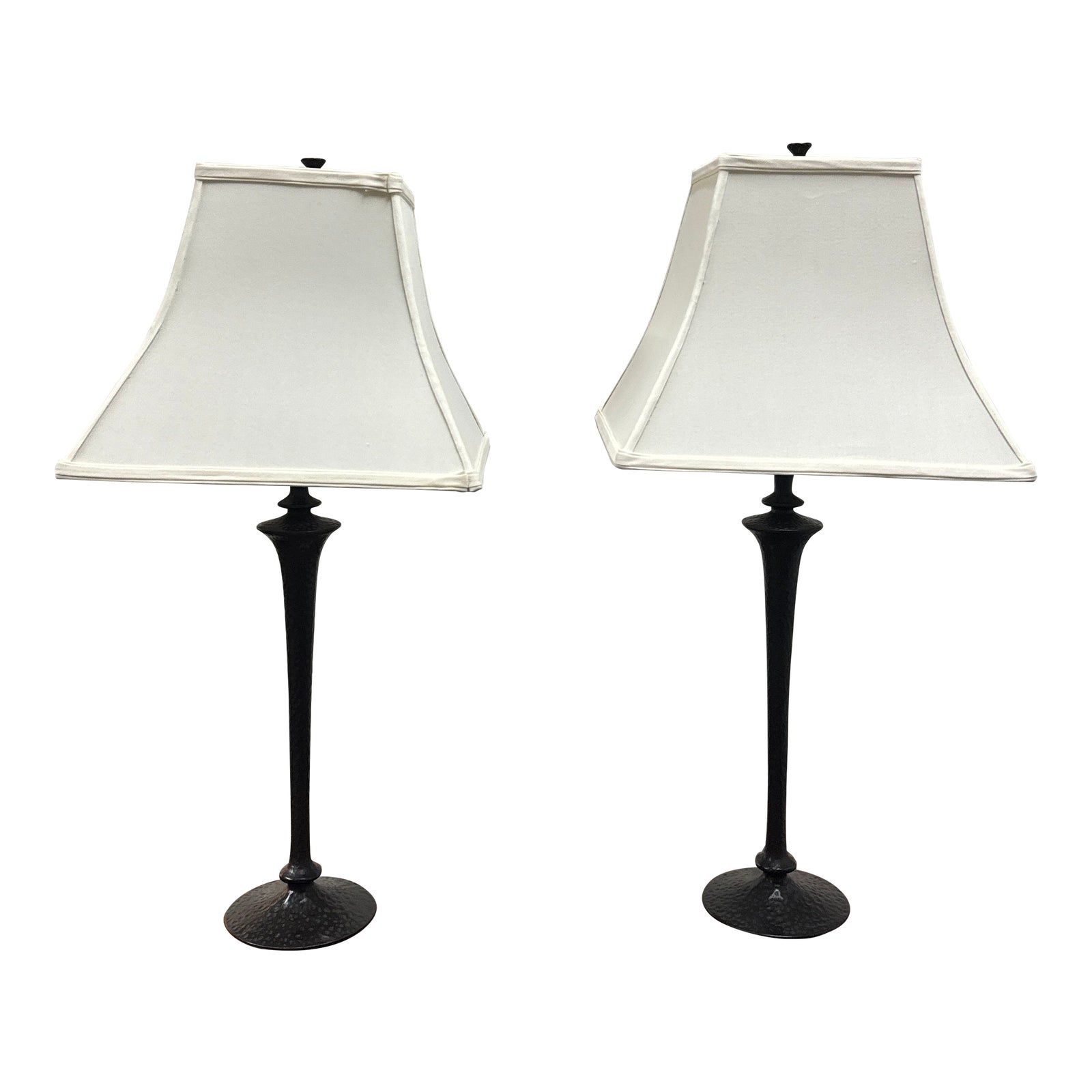 Design Plus Galler presents a Pair of Antiqued Metal Table Lamps from Restoration Hardware. This duo is heavy with a candlestick type base. The metal work has a hammered finish and a dark bronze tone. Comes with two trumpet shades. They are in good condition, consistent with their age + use. These are discontinued models.