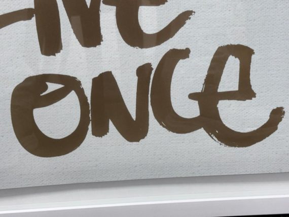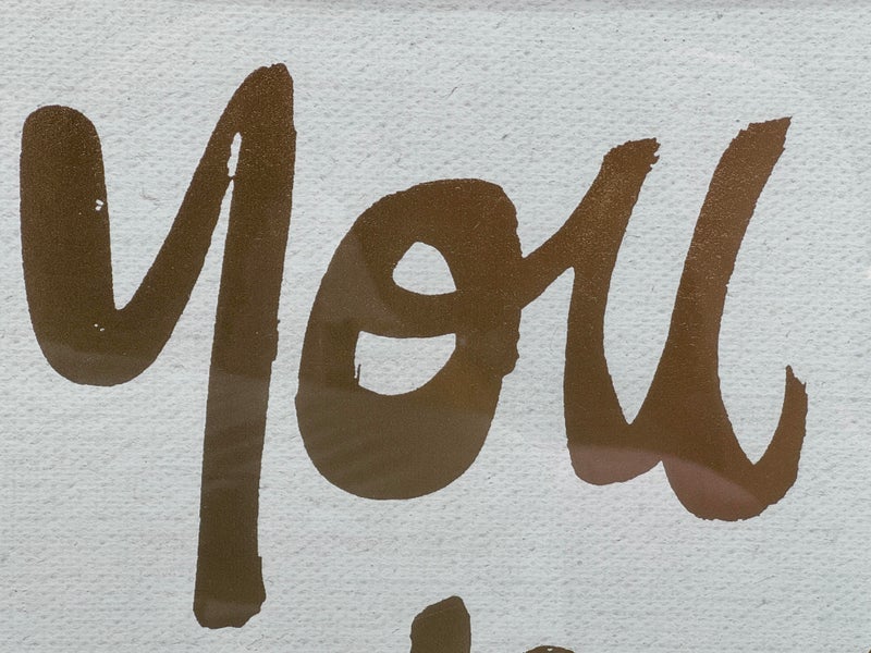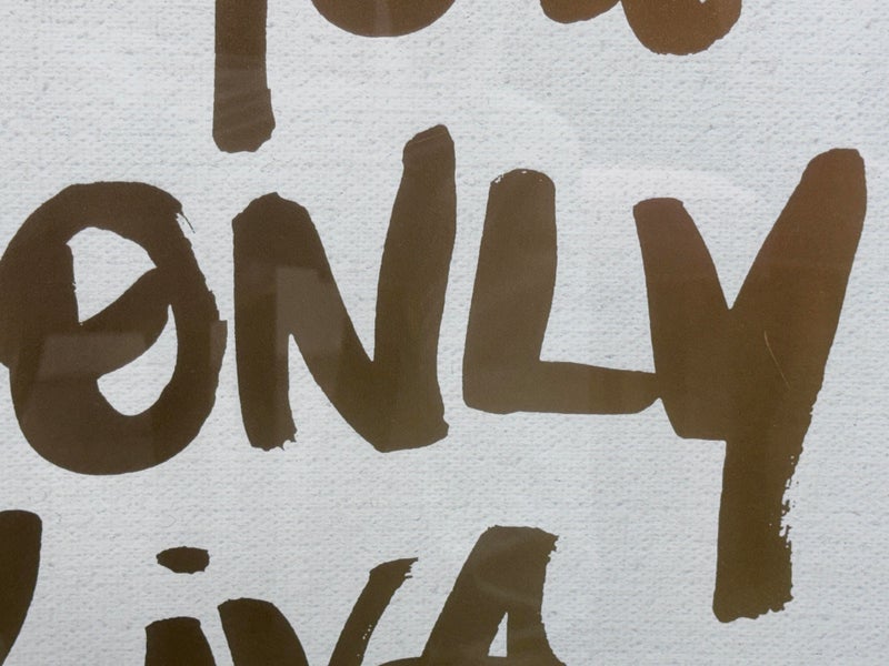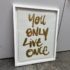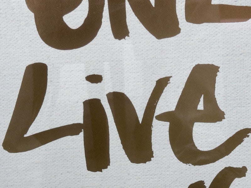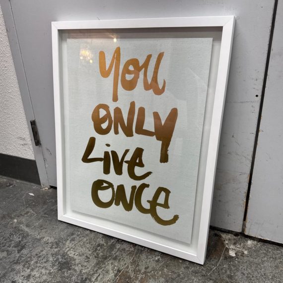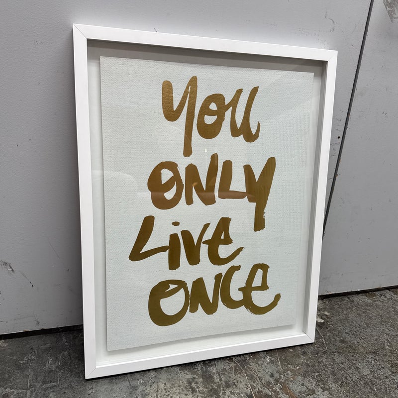 Design Plus Gallery presents the Oliver Gal ‘Yolo” Typography and Quotes Wall Art from Restoration Hardware Teen. Framed Canvas Print Motivational Quotes and Sayings – Gold, White, this one saying “You Only Live Once” in cursive. Is in good condition with minimal wear for its age + use.