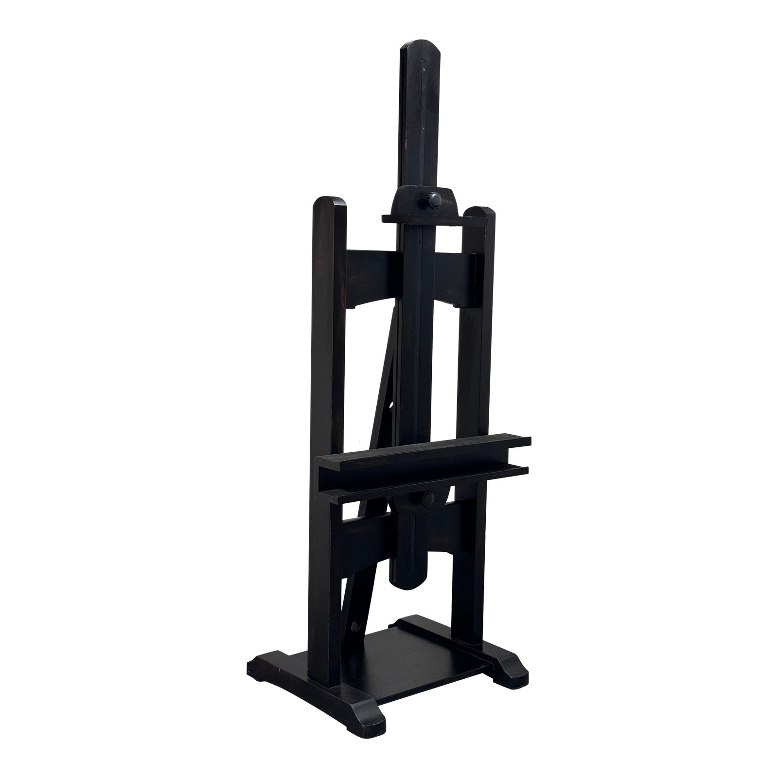 Design Plus Gallery presents a Wooden Easel from Restoration Hardware. The unit will accommodate a flat screen up from 42 to 60 inches or 170lbs, or either art or mirror. Built of solid hardwood the height-adjustable design has been hand-finished in ebony. The wire management keeps cords hidden and secure. The easel has been fitted with small wheels for mobility. Is in good condition with wear that is consistent with its age + use.