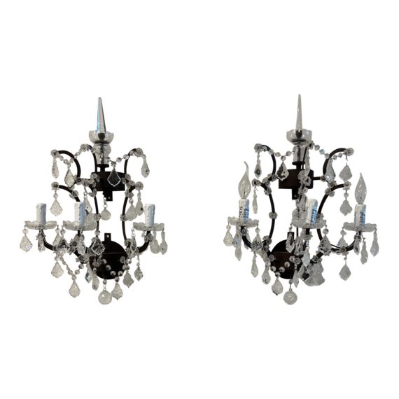 Design Plus Gallery presents a Restoration Hardware Timothy Oulton Three Light Crystal Wall Sconces, a Pair. Features include a rustic metal frame and an assortment of precision-cut, polished crystal glass. The sconces’ design is inspired by both late Georgian era chandeliers and Victorian English lighting. The incorporated Georgian hallmarks include large crystal balusters, candle lights, and bobeche dishes that traditionally collect wax from lit candles. This, combined with an antique rust finish, gives the sconces their genuine Timothy Oulton appearance. Minor wear from use; sconces are in good condition.
