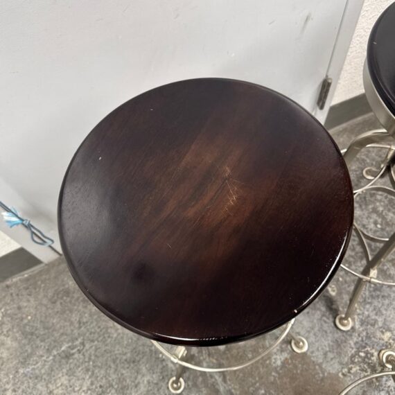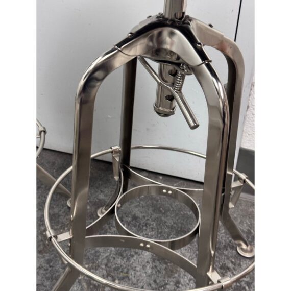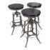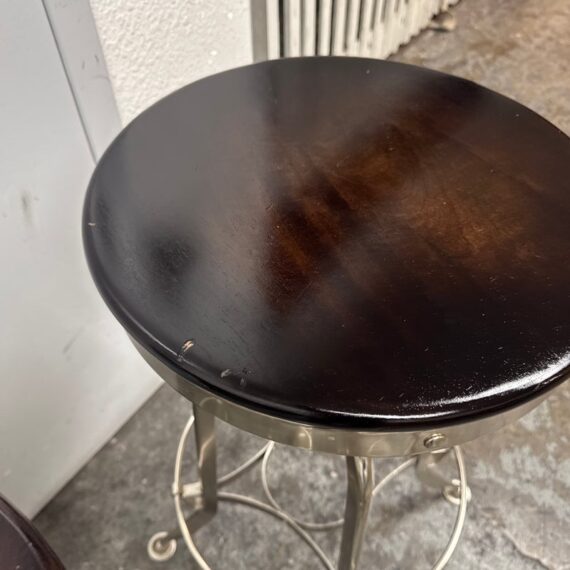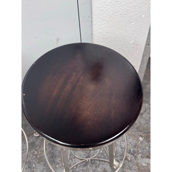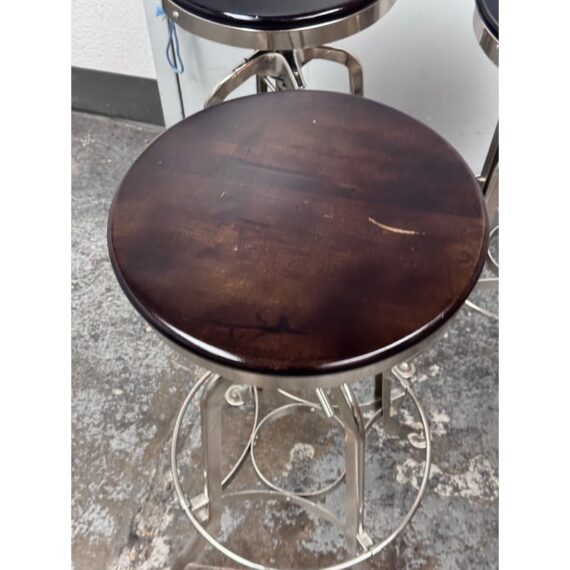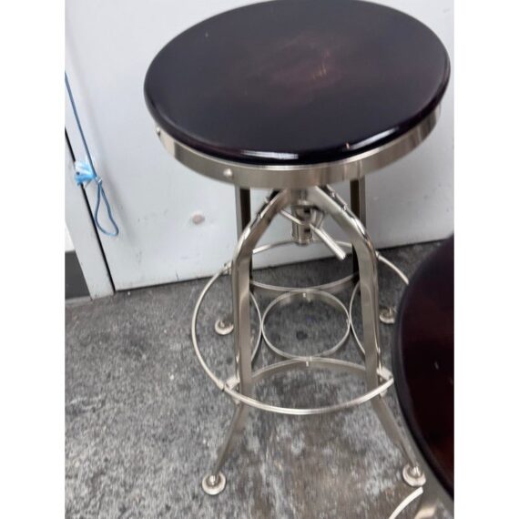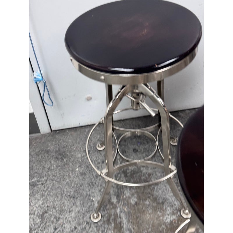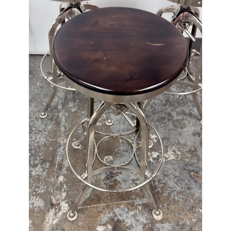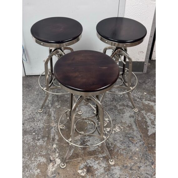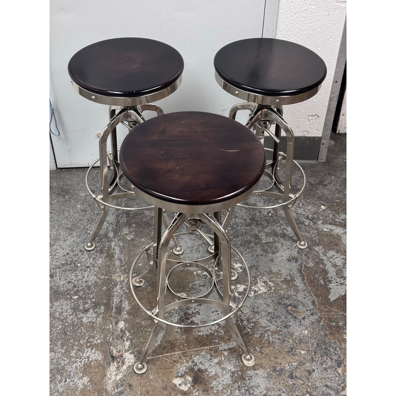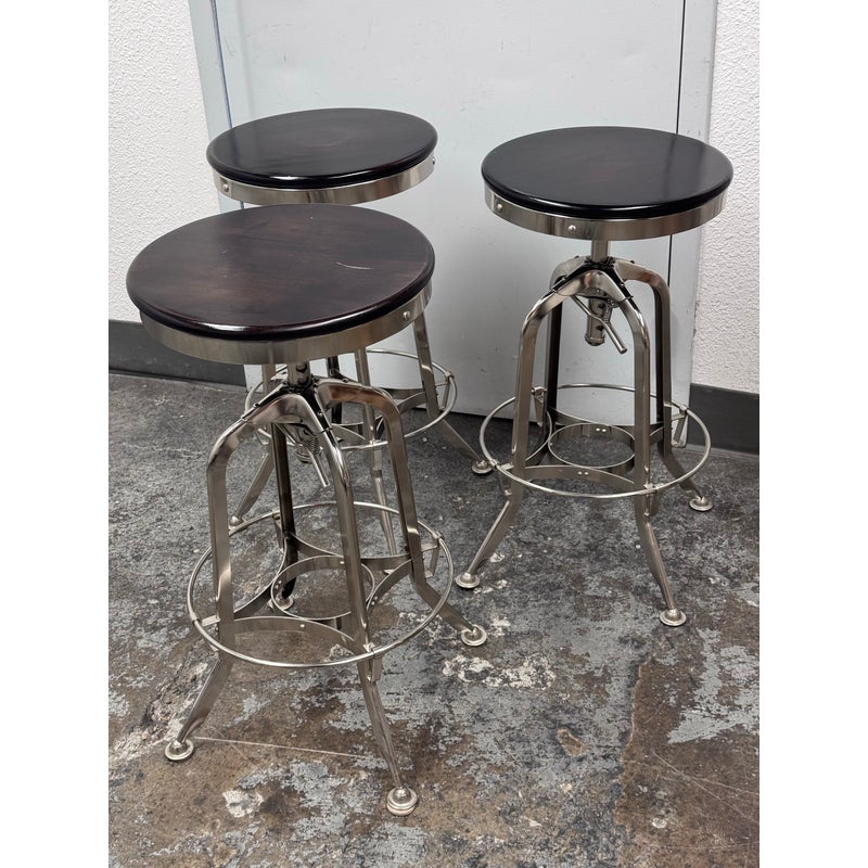 Design Plus Gallery presents a Set of Three Toledo Bar Stools from Restoration Hardware. These are an industrial reproduction of the classic vintage inspired craftsmanship chairs. Their induction styling contrasts the warmth of wood seating. Seat is brown antiquated wood with polished chrome base. Level bellow seat controls height. Is in good condition with visible and minimal wear for its usage. Made in India.