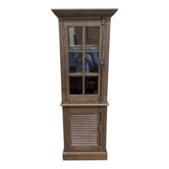 Design Plus Gallery presents a Restoration Hardware Two Piece French Casement Cabinet. moldings and frame are stained with a rich and smokey walnut tone (Brown Oak Drifted.) Base and top can be separated. Old world French inspired moldings, wrought iron hardware and glass panels give an architectural salvaged look. Unit comes with a total of three adjustable shelves. Door front on lower cabinet is ventilated. Minor wear through out and one scratch, unit is in good condition. Ideal for office, kitchen, bathroom and closet storage. Made in Vietnam, collection is current and can be added to through Restoration Hardware.