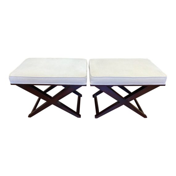 Design Plus Gallery presents a Pair of Westwood Benches by Restoration Hardware. Handcrafted of solid hardwood with mahogany veneers. Hand-rubbed deep bordeaux finish highlights the natural character of the wood’s grain. Upholstered in a cream fabric. Minor wear. Showcase them together or separately.