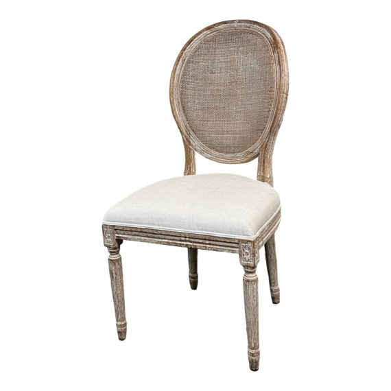 Design Plus Gallery presents a Vintage French Round Cane Back Fabric Dining Side by Restoration Hardware. A classic Louis XVI dining chair with a light and airy caned back, a version of the chair popular during the French colonial period. A solid oak chair features a linear form, nuanced carving and scrollwork, and tapered legs. Visible marking’s on fabric and frame and minor wear from usage. Made in China.