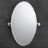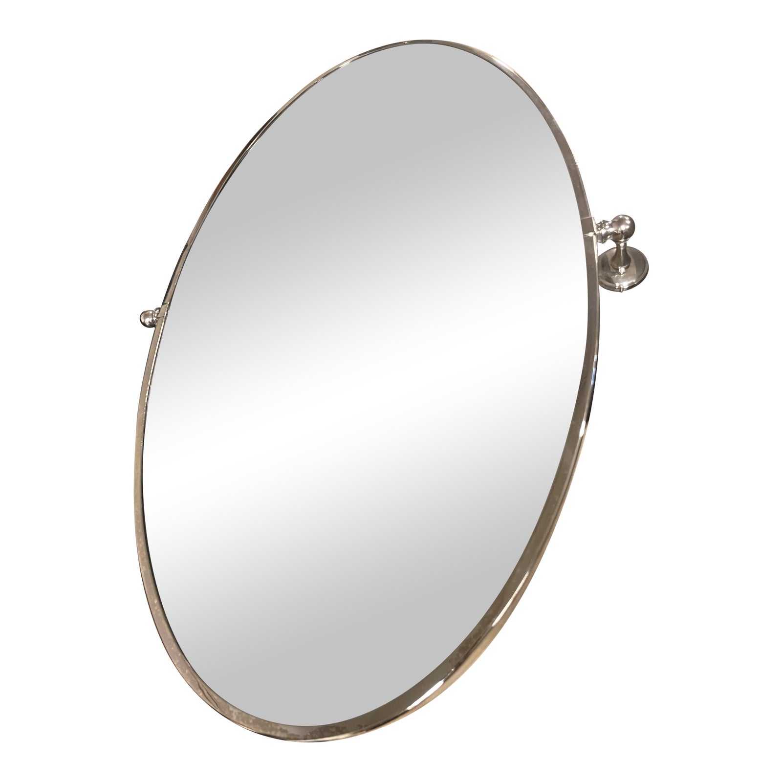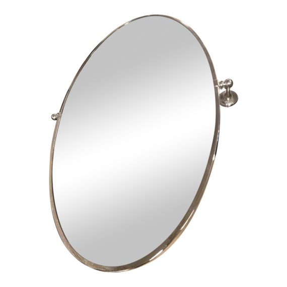 Oval frame is made of solid, non-corrosive, polished nickel. Beveled mirror on the interior is able to tilt with the side mounting brackets. Professional installation recommended when mounting on tile or stone surfaces. There is minor wear through out, mirror is in good condition.