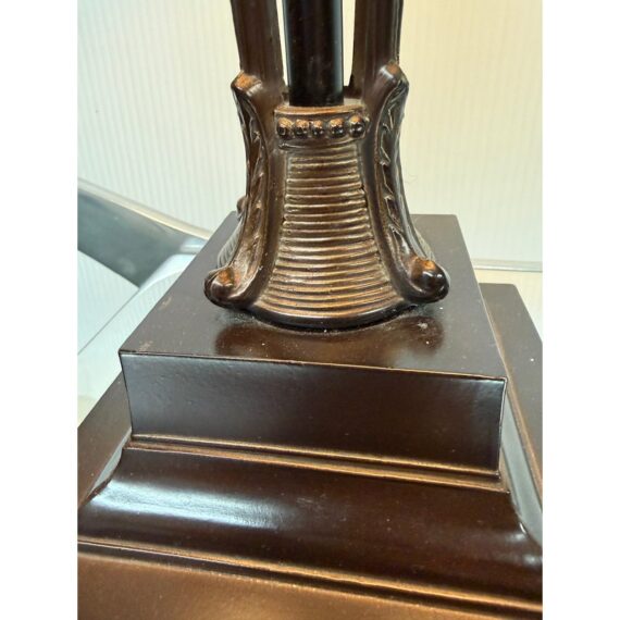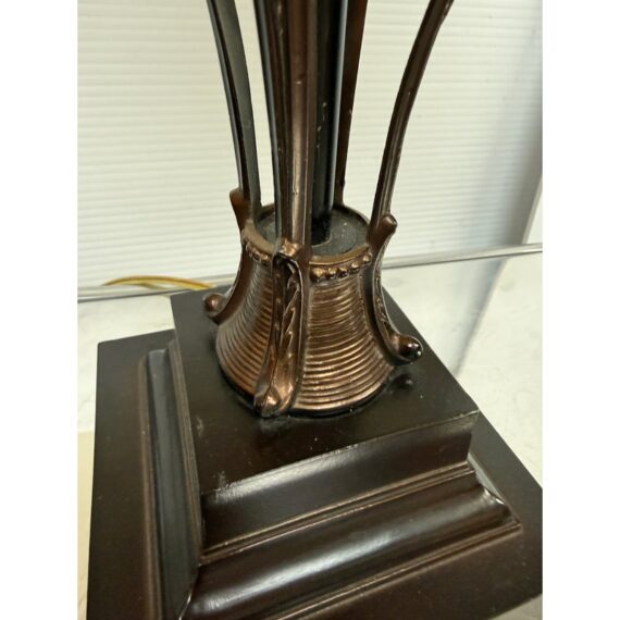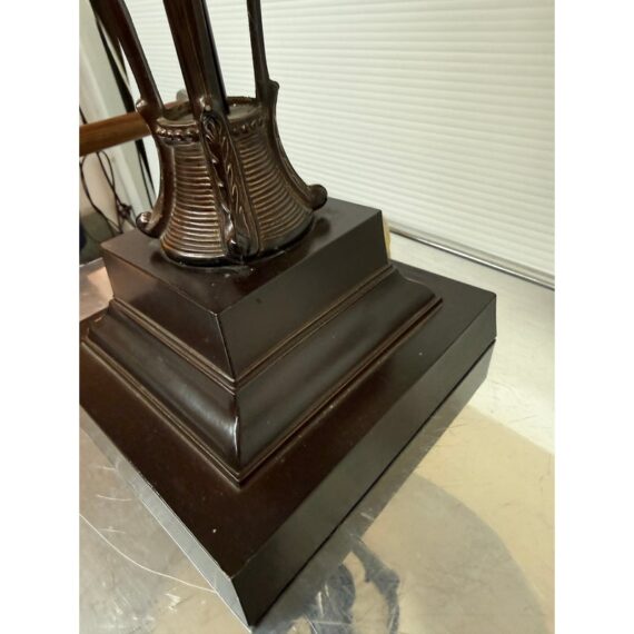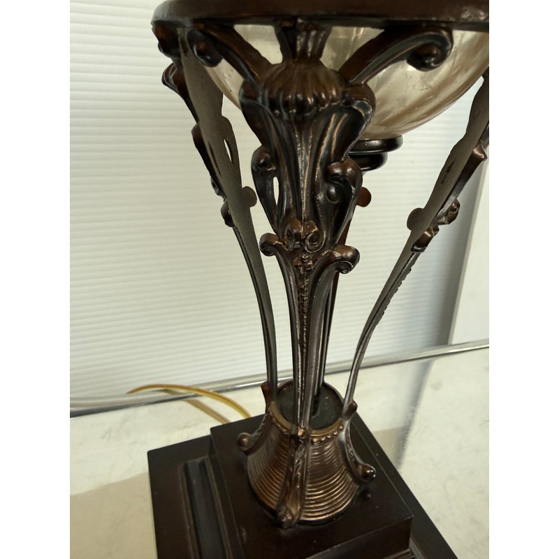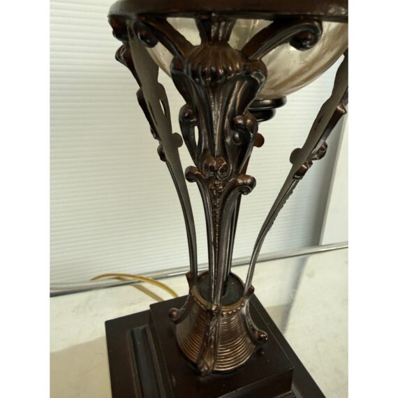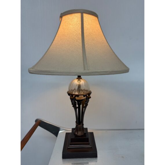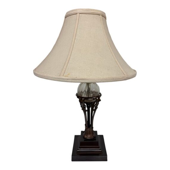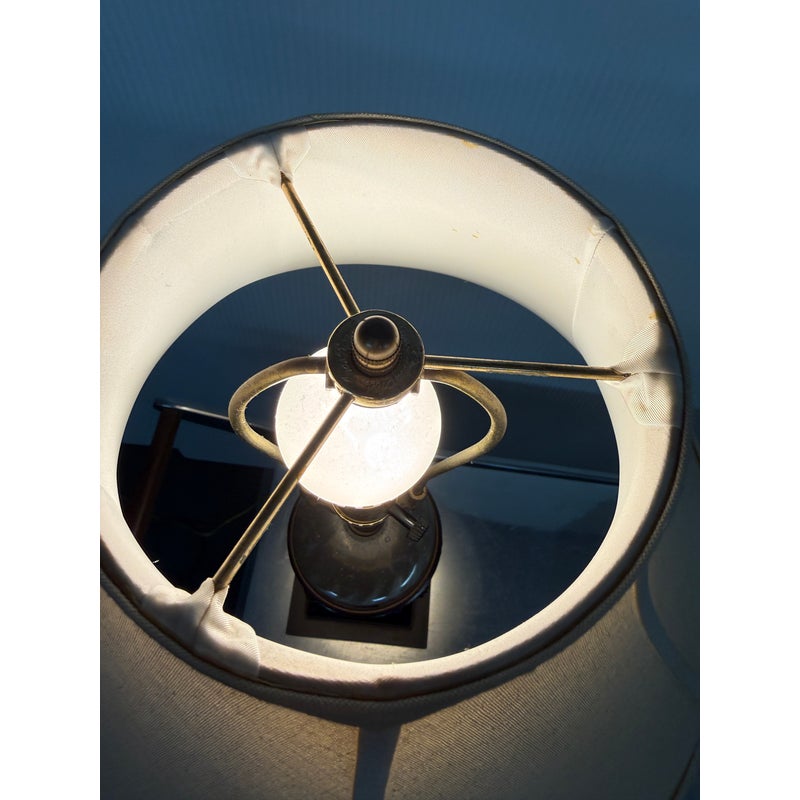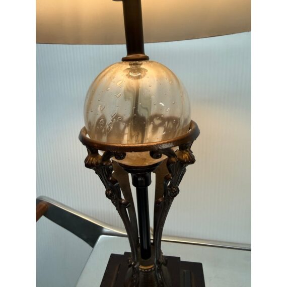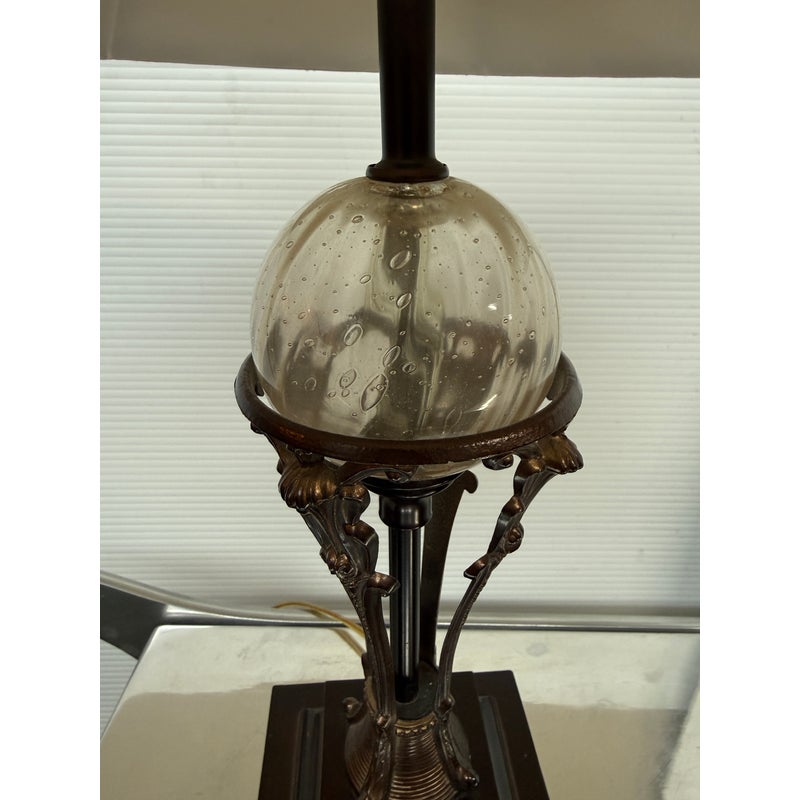 Design Plus Gallery presents a Vintage Style Table Lamp from Restoration Hardware. The lamp is like an embellished reproduction of an earlier era. The base has an oiled bronze stand that cradles a smooth glass orb. The table lamp is fitted with a taupe linen shade. There is light wear; condition is good for age and use.