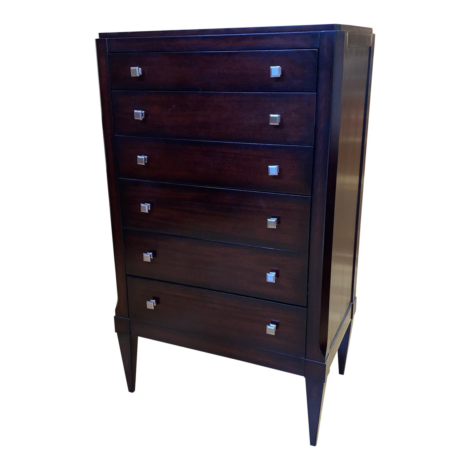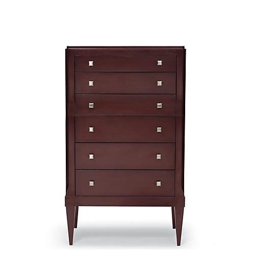 Design Plus Gallery presents a Westwood Lingerie Chest by Restoration Hardware. Handcrafted of solid hardwood with mahogany veneers. Mortise-and-tenon joinery with English-dovetailed solid cedar drawers. Hand-rubbed deep bordeaux finish highlights the natural character of the wood’s grain. Satin nickel-finished solid brass hardware. Consist of six drawers and taped legs. Minor wear. Made in Vietnam