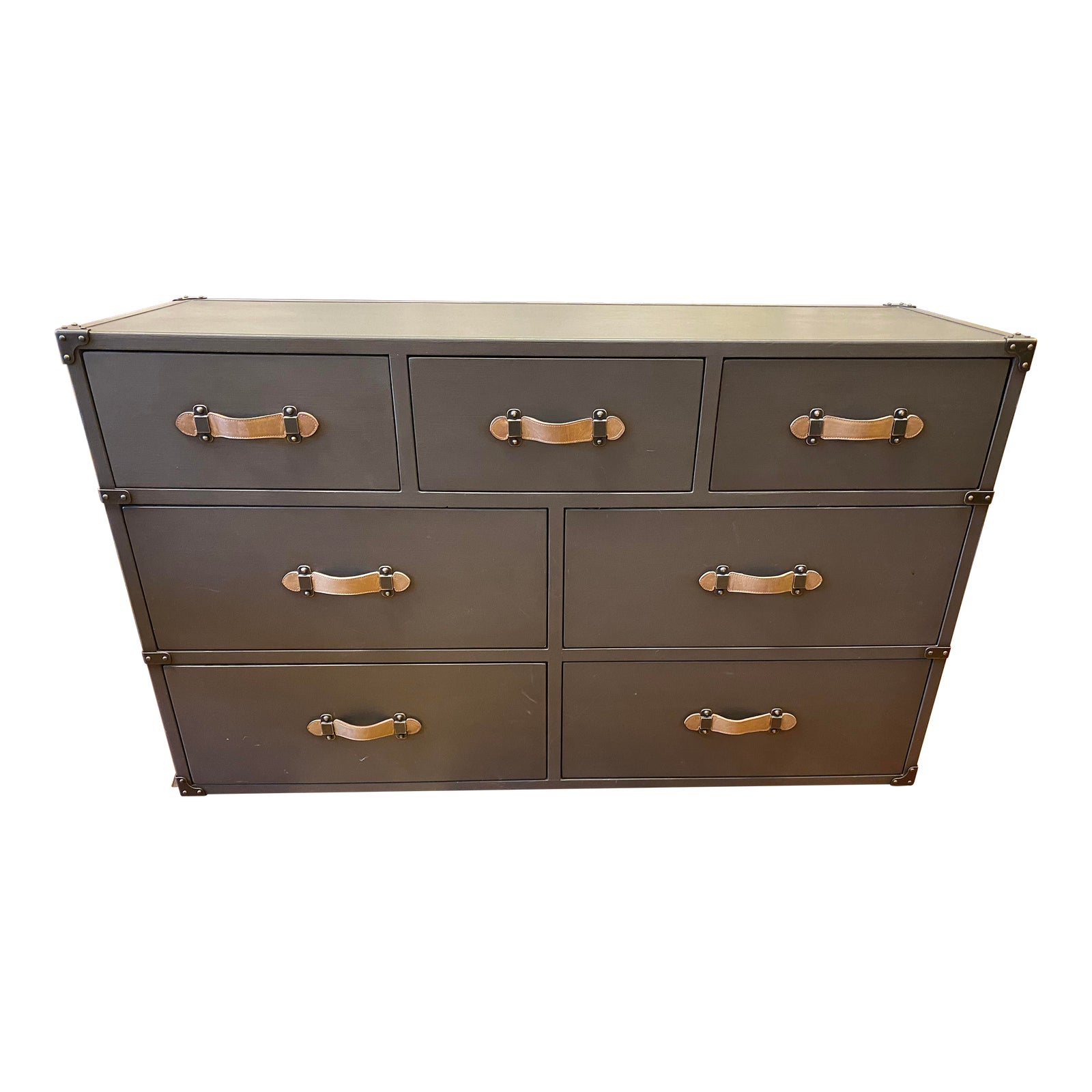Design Plus Gallery presents a Wilkes Trunk Wide Dresser by Restoration Hardware. Metal-bound corner brackets give a look and feel of classic wood storage trunks, while the distressed leather drawer pulls lend the rustic appeal of vintage agricultural crates. This is a discontinued model. Visible scratches + wear from usage + age. Made in Vietnam.