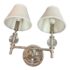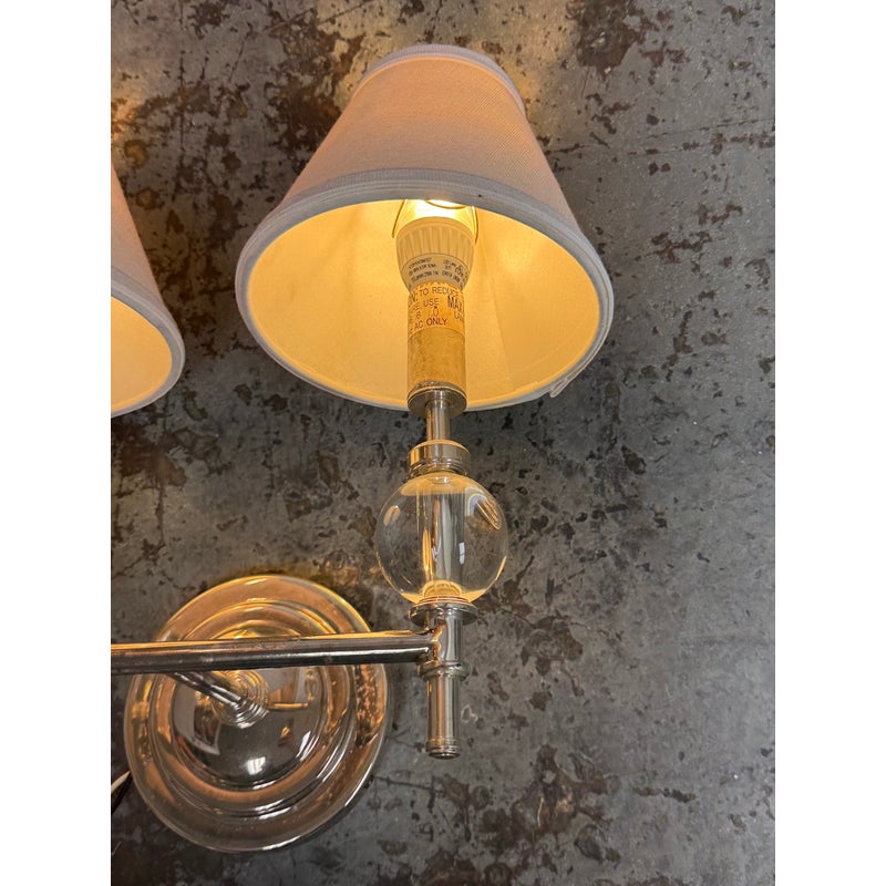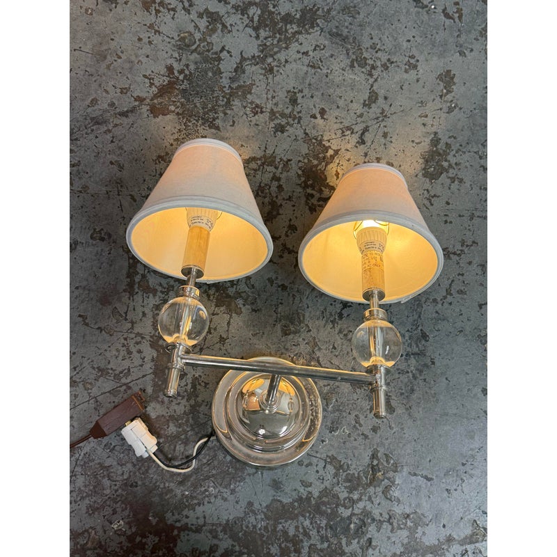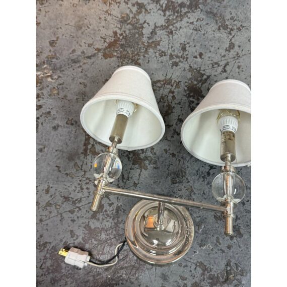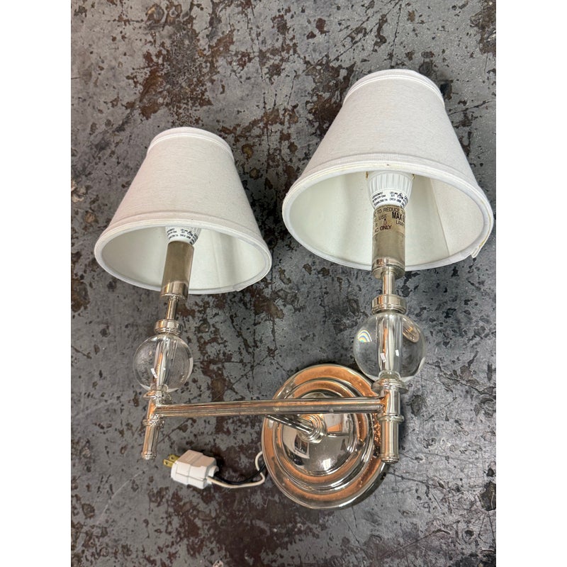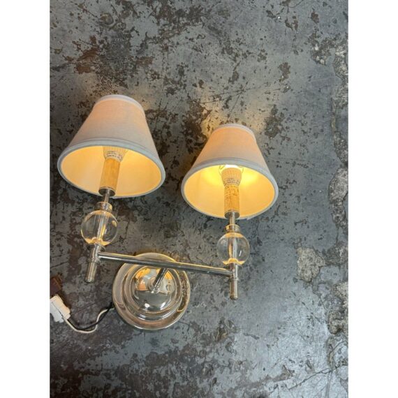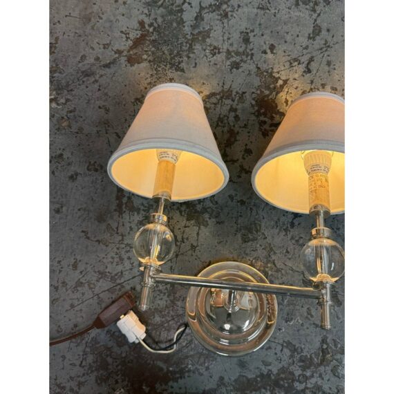 Design Plus Gallery presents a Wilshire Sconce from Restoration Hardware. This sconce showcases a dual-arm design anchored by a round backplate, supporting two tapered fabric shades that diffuse light evenly across a space. Glass sphere accents add visual interest along the vertical stems, while the horizontal bar creates symmetry and structure. Ideal for flanking mirrors, artwork, or bedsides, this fixture works well in both traditional and transitional interiors, offering practical illumination with a timeless presence. This is a discontinued model with the brand. In good condition, visible and minimal wear from usage.