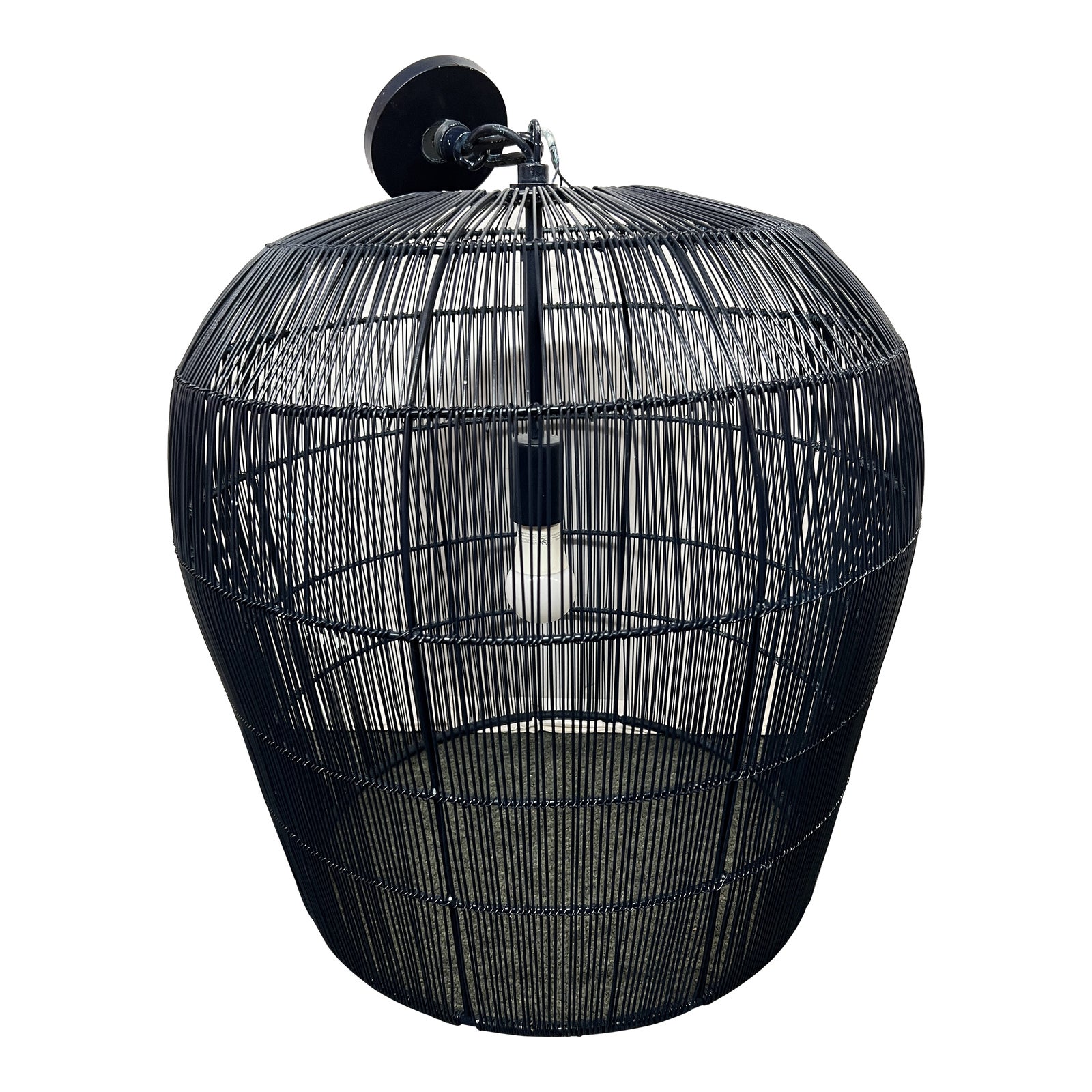 Design Plus Gallery presents the Wire Dome Pendant by Restoration Hardware. The classic industrial dome gets an updated look in new colorful materials. Slim wires wrap vertically around the basic steel frame, creating the linear weave. Light from the single 100W bulb (not included) filters through, creating a play of shadows. Pendant was painted navy post purchase; no evidence of wear otherwise.